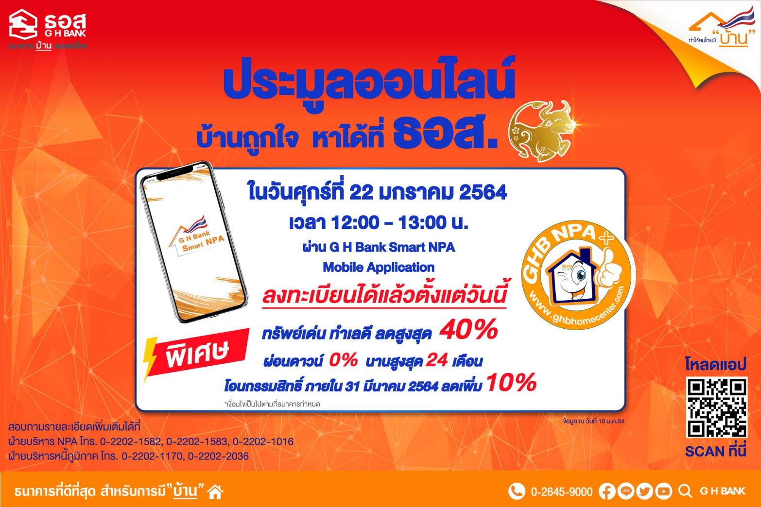 ทั้งนี้ ผู้ที่สนใจเข้าร่วมประมูลสามารถดาวน์โหลด Application : G H Bank Smart NPA และลงทะเบียนเข้าร่วมประมูลออนไลน์ได้จนถึงวันที่ 22 มกราคม 2564 เวลา 12.40 น.(เฉพาะลูกค้าที่ยังไม่เคยลงทะเบียน) ติดตามข้อมูลข่าวสารของธนาคารเพิ่มเติมได้ที่ www.ghbhomecenter.com และ www.ghbank.co.th หรือติดต่อสอบถามรายละเอียดเพิ่มเติมที่ฝ่ายบริหาร NPA โทร. 0-2202-1582-3 และ 0-2202-1016 และฝ่ายบริหารหนี้ภูมิภาค โทร.0-2202-1170 และ 0-2202-2036 ![]()