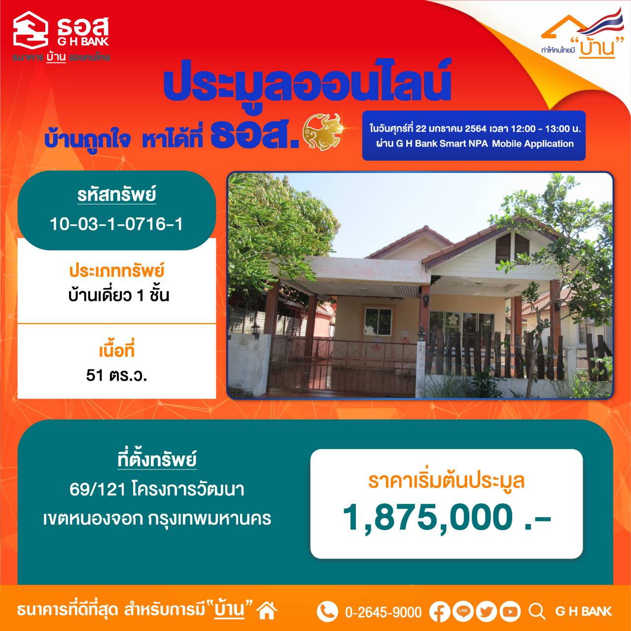 โดยนำทรัพย์คัดทรัพย์ใหม่สภาพดีทั่วประเทศรวม 990 รายการ ทั้งประเภททาวน์เฮ้าส์ บ้านเดี่ยว บ้านแฝด ห้องชุด อาคารพาณิชย์ และที่ดินเปล่า มาเปิดประมูลให้กับลูกค้าที่ต้องการมีบ้านได้เลือกซื้อง่าย ๆ พร้อมกันทั่วประเทศผ่าน Application : G H Bank Smart NPA แบ่งเป็นทรัพย์ที่ตั้งอยู่ในพื้นที่กรุงเทพฯ และปริมณฑล จำนวน 491 รายการ มีรายการที่น่าสนใจ อาทิ รายการที่ราคาเริ่มต้นประมูลต่ำสุดเพียง 45,000 บาท ได้แก่ ห้องชุด โครงการปลาทอง เนื้อที่ 26.25 ตารางเมตร อ.เมือง จ.ปทุมธานี