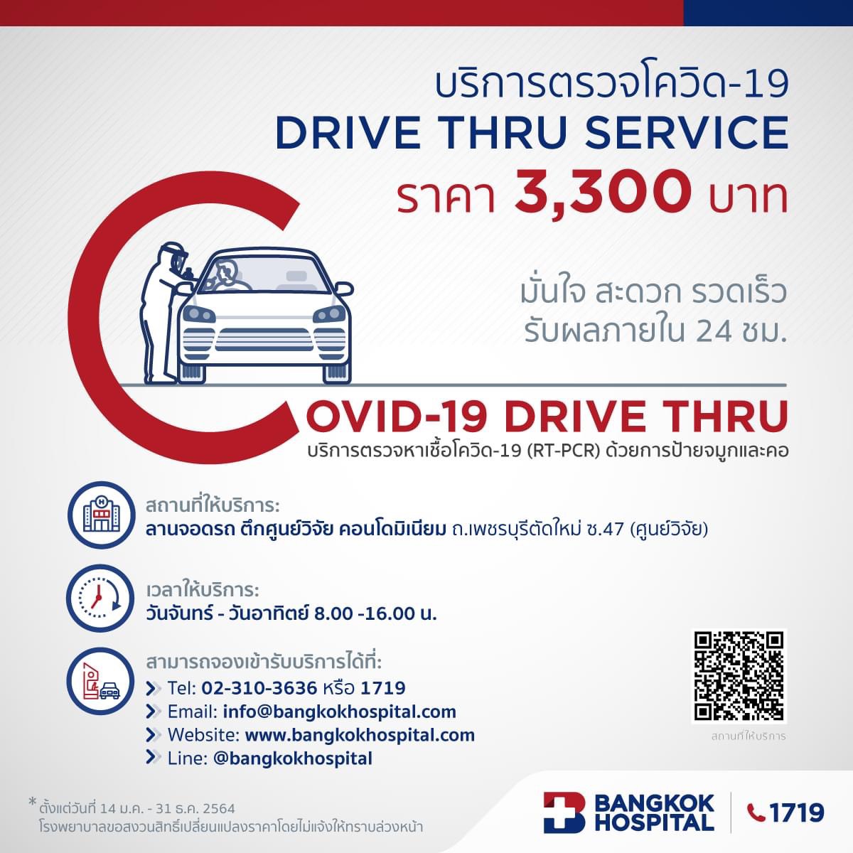 22 มกราคม 2564 : รพ.กรุงเทพ ก้าวสู่ปีที่ 50 ด้วยความห่วงใยและอยากเห็นคนไทยสุขภาพดี ห่างไกลโควิด-19 ด้วย บริการตรวจหาเชื้อโควิด-19 แบบ DRIVE THRU SERVICE (RT-PCR) โดยวิธีการป้ายจมูกและคอ ราคา 3,300 บาท* ณ บริเวณลานจอดรถ อาคารศูนย์วิจัยคอนโดมิเนียม ในซอยเพชรบุรี 47 (ศูนย์วิจัย) เป็นจุดตรวจหาโรคแยกจากตัวอาคารโรงพยาบาล เพื่อสร้างความมั่นใจให้กับผู้ป่วยที่มาใช้บริการ เปิดให้บริการทุกวัน ตั้งแต่เวลา 8.00 -16.00 น. (*การตรวจนี้เฉพาะผลการตรวจโควิด-19 ไม่รวมเอกสารทางการแพทย์อื่นๆ