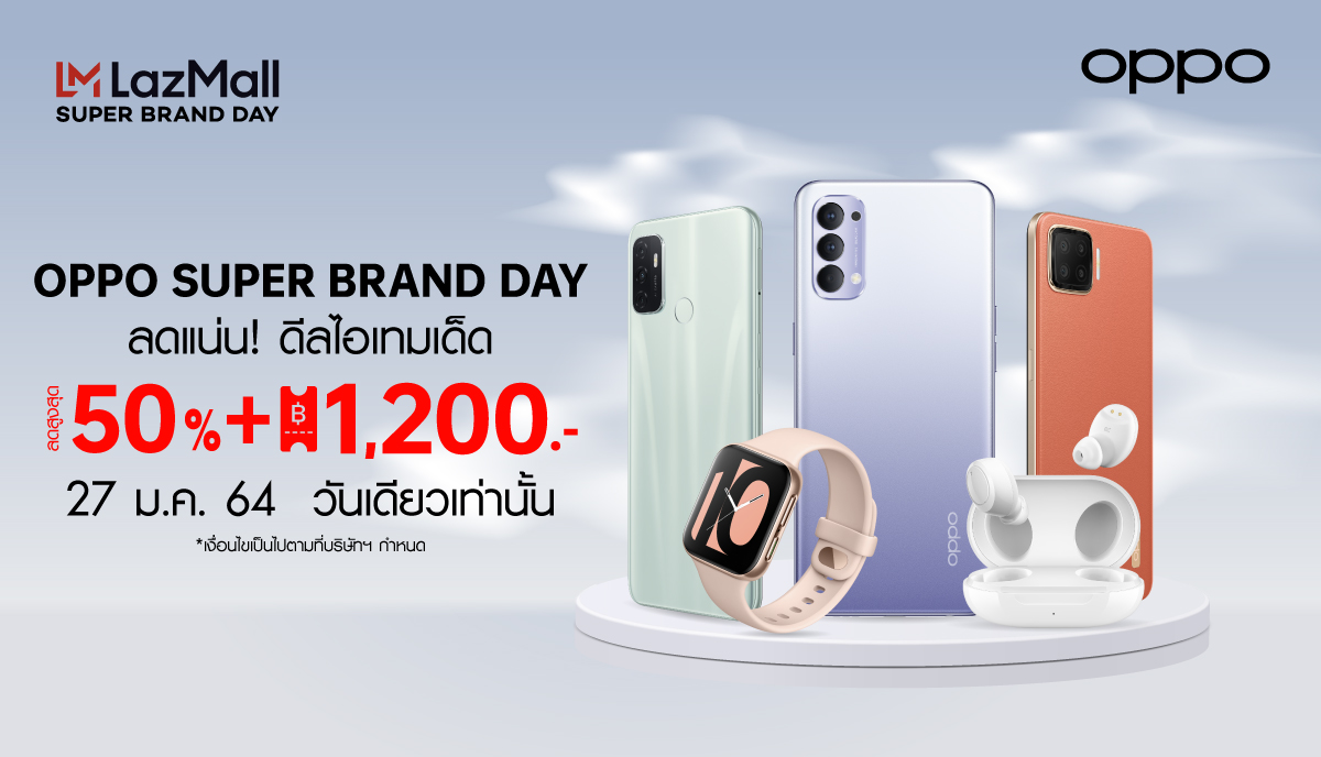 25 มกราคม 2564 : OPPO มอบโปรโมชั่นสุดคุ้มในแคมเปญ OPPO SUPER BRAND DAY ทั้งลดทั้งแถม เมื่อซื้อสมาร์ทโฟน OPPO หรืออุปกรณ์เสริม โดยลดสูงสุด 50% พร้อมคูปองส่วนลดสูงสุด 1,200 บาท และของสมนาคุณอีก 244,525 บาท! ในวันที่ 27 มกราคม 2564 เท่านั้น! ที่ OPPO Official Store ใน Lazada โดยโปรแรงสุดคุ้มห้ามพลาด มีรายละเอียด ดังนี้