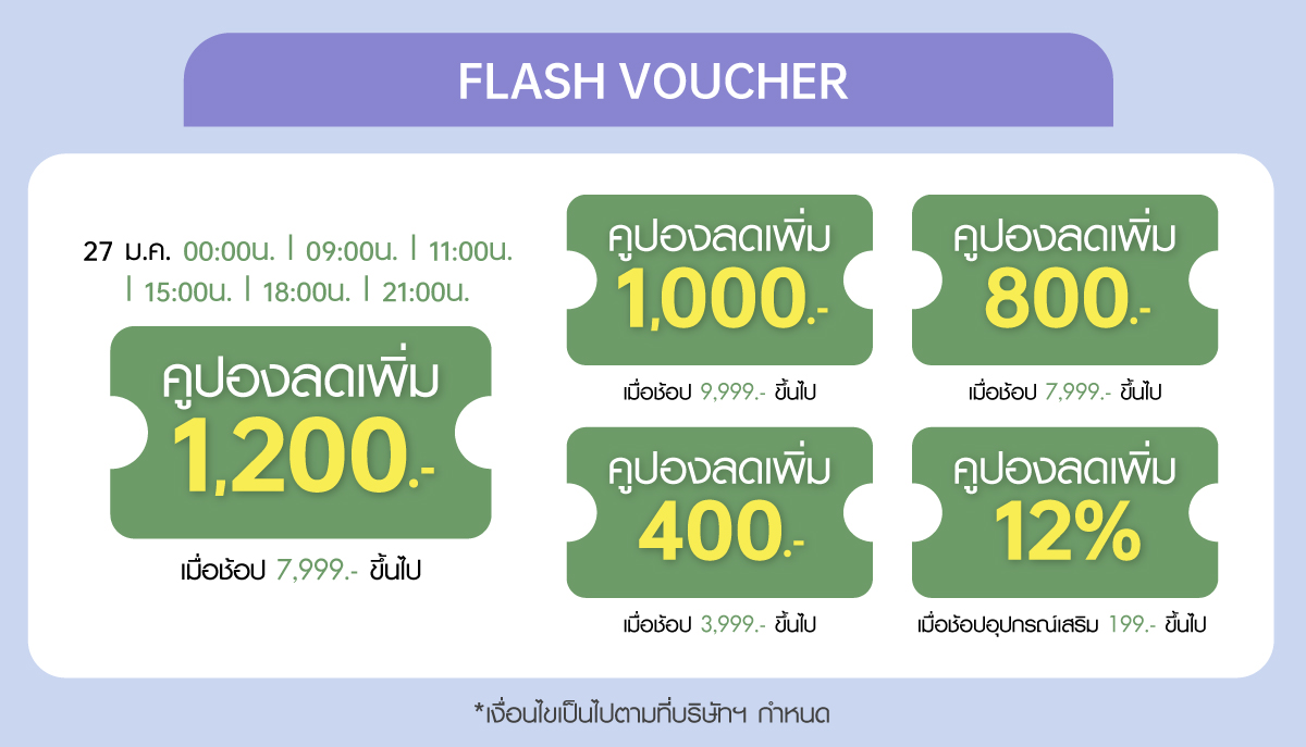 Always on Voucher คูปองแจกตลอดวัน โดยใช้ได้ตลอดวันที่ 27 มกราคม 2564 ดังนี้ ส่วนลด 400 บาท เมื่อซื้อขั้นต่ำ 3,999 บาท, ส่วนลด 800 บาท เมื่อซื้อขั้นต่ำ 7,999 บาท และ ส่วนลด 1,000 บาท เมื่อซื้อขั้นต่ำ 9,999 บาท เฉพาะสินค้าที่ร่วมรายการเท่านั้น หรือ ใช้คูปองร่วมกับส่วนลด 12% ของอุปกรณ์เสริม โดยลดสูงสุด 500 บาท เมื่อซื้อขั้นต่ำ 199 บาท
