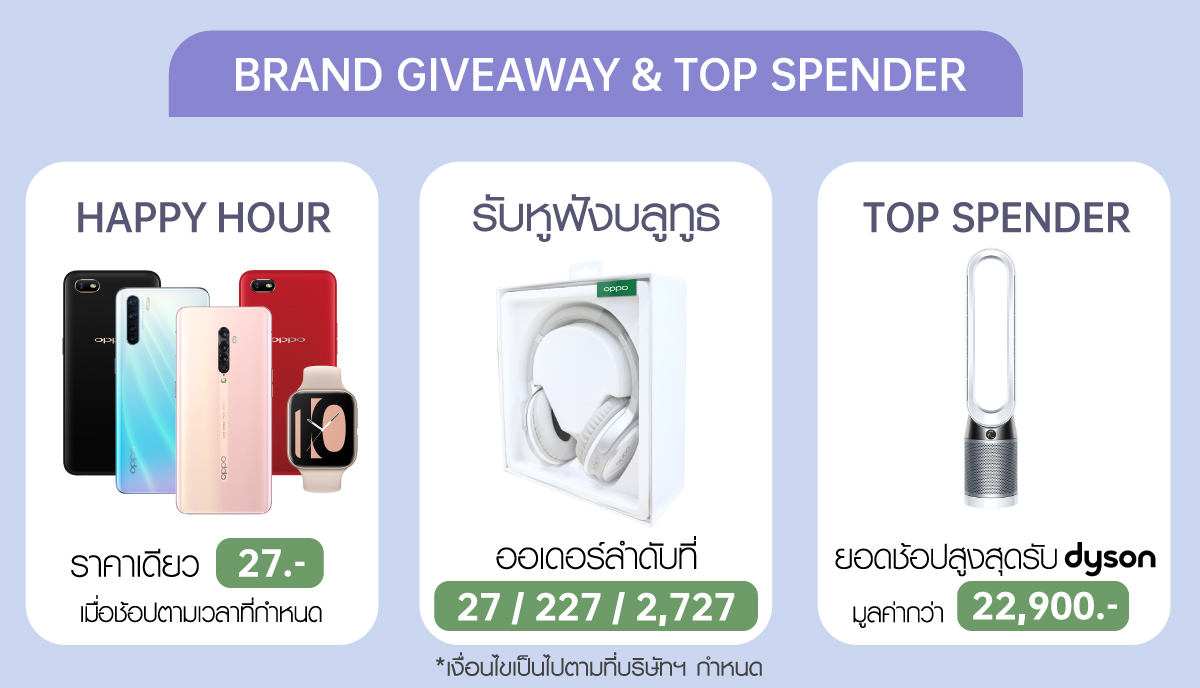 ผู้ที่มียอดซื้อสูงสุด เป็นอันดับแรก รับฟรี! เครื่องฟอกอากาศ Dyson Pure Cool™ Air Purifier TP04 มูลค่า 22,900 บาท และรางวัลสุดพิเศษอื่นๆ อีกมากมายโดยประกาศรายชื่อ Top Spender ในวันที่ 15 กุมภาพันธ์ 2564 ผ่าน OPPO Official Store และเริ่มจัดส่งสินค้าในวันที่ 1 มีนาคม 2564