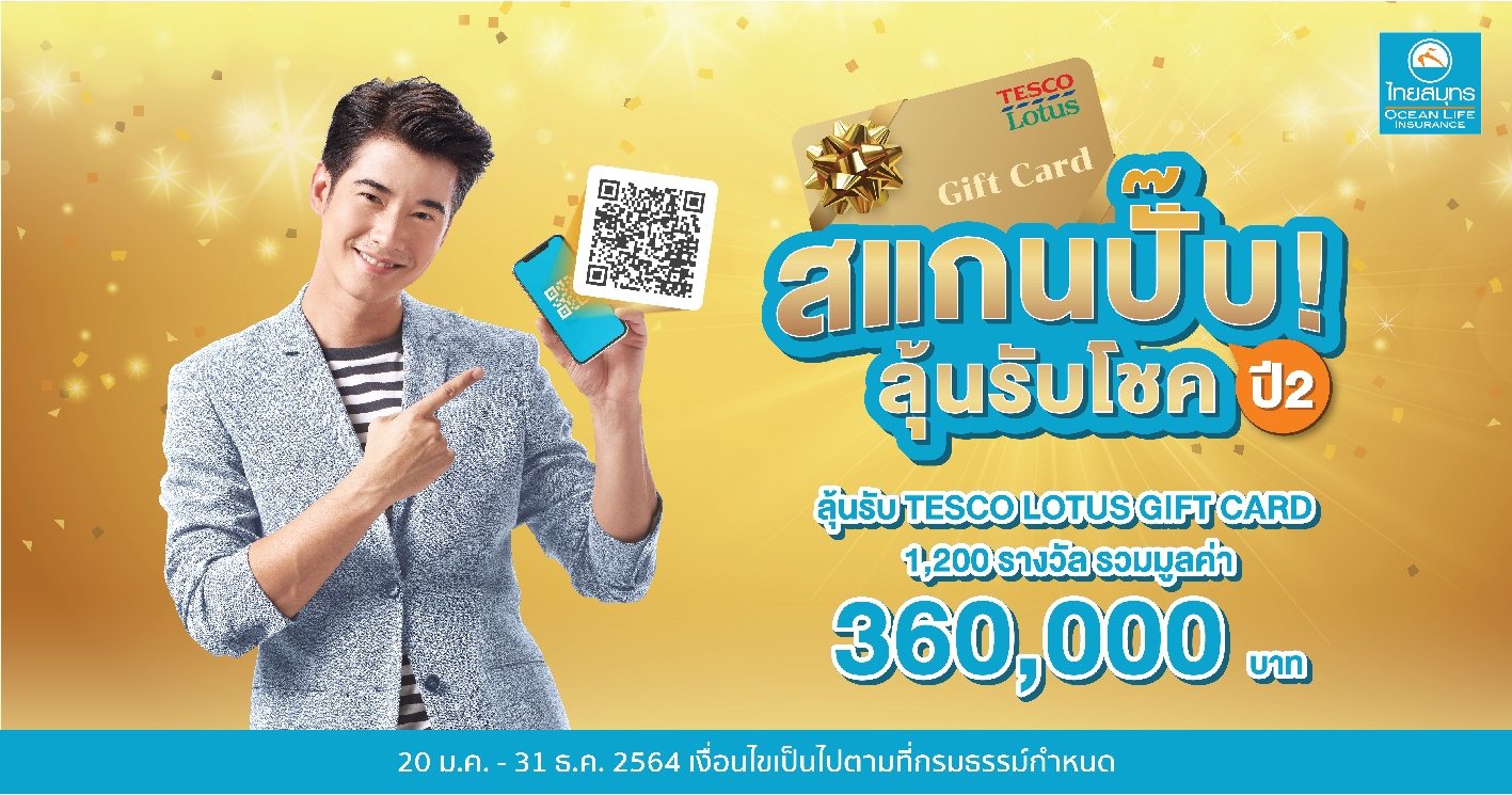 เพียงลูกค้าชำระเบี้ยประกันภัยปีต่อ ด้วยการสแกน QR Code ผ่านช่องทาง Mobile Banking และลงทะเบียน OCEAN CONNECT ผ่าน LINE @oceanlife หรือ OCEAN CLUB APPLICATION ก็สามารถลุ้นรับ Tesco Lotus Gift Card มูลค่า 300 บาท เดือนละ 100 รางวัล เป็นระยะเวลา 12 เดือน รวมมูลค่า 360,000 บาท ตามหลักเกณฑ์และเงื่อนไขที่บริษัทกำหนด ตั้งแต่วันนี้ - 31 ธันวาคม 2564