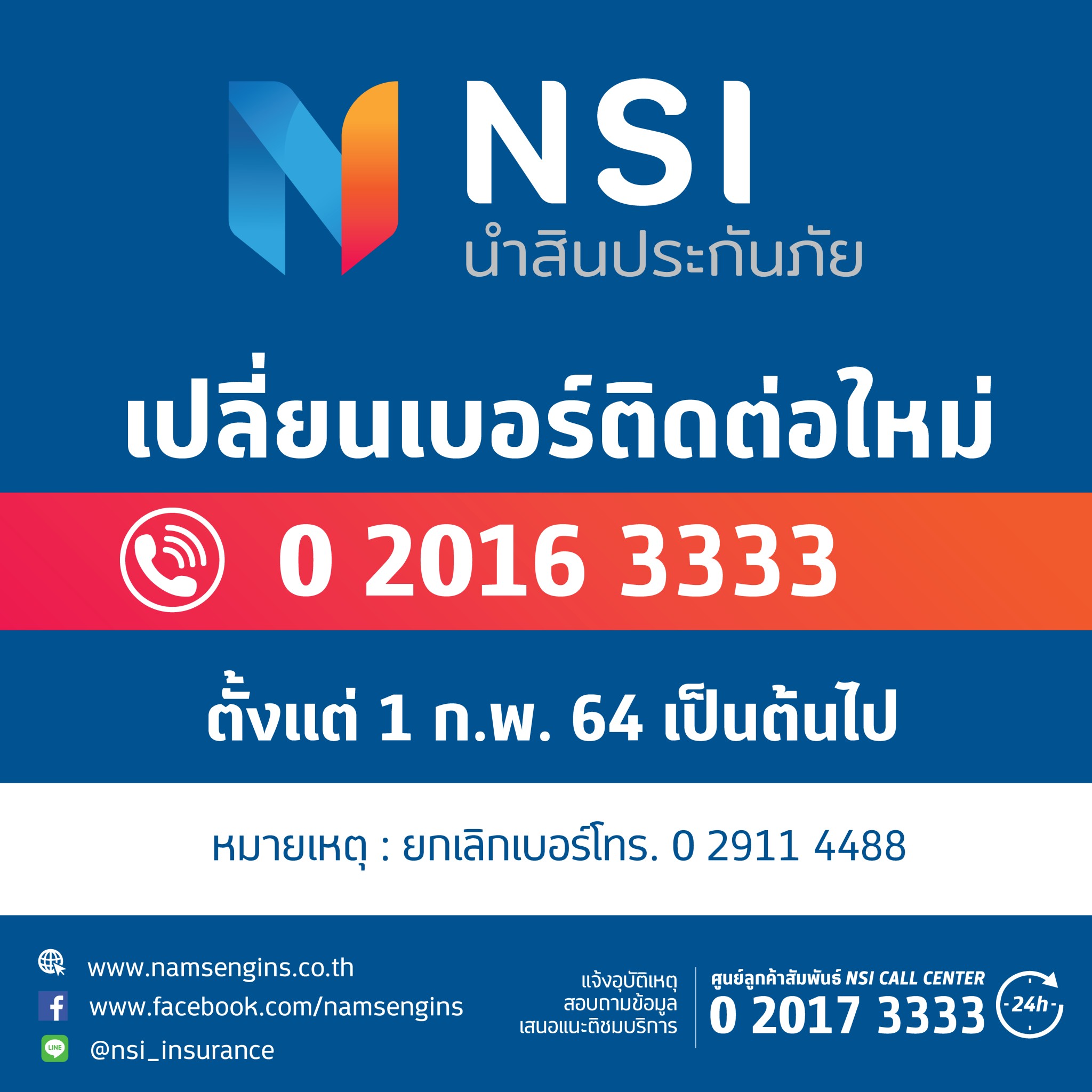 29 ทกราคม 2564 : บริษัท นำสินประกันภัย จำกัด (มหาชน) เปลี่ยนหมายเลขโทรศัพท์สำหรับติดต่อสำนักงานใหญ่ จากเบอร์ 0 2911 4488 เป็นเบอร์ 0 2016 3333 ตั้งแต่วันที่ 1 กุมภาพันธ์ 2564 เป็นต้นไป เพื่อประสิทธิภาพในการให้บริการ
