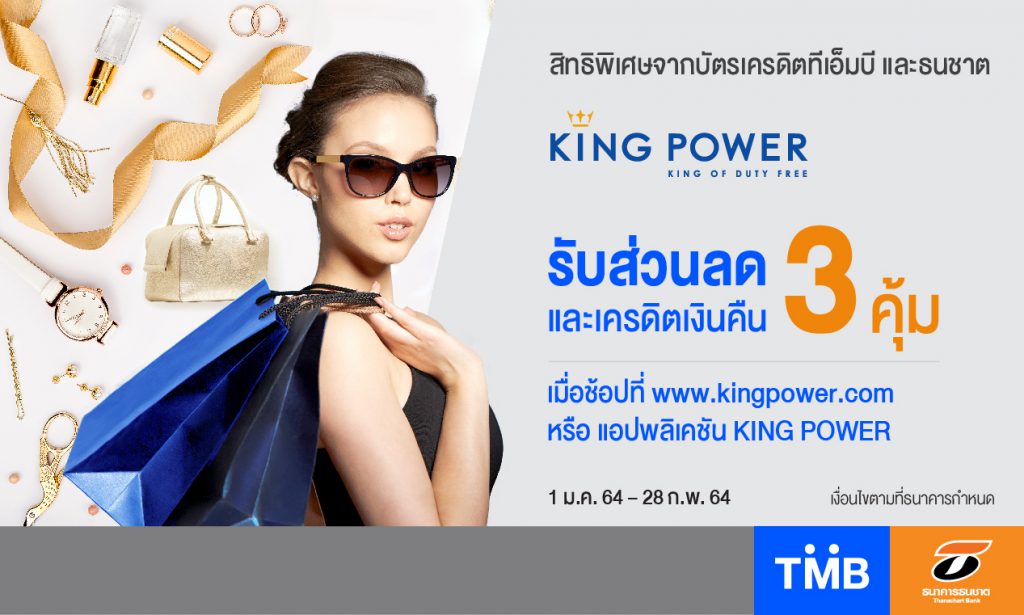1 กุมภาพันธ์ 2564 : บัตรเครดิตทีเอ็มบีและบัตรเครดิตธนชาต ร่วมกับ คิง พาวเวอร์ ให้สมาชิกบัตรรับส่วนลดและเครดิตเงินคืน 3 คุ้ม เมื่อช้อปที่ www.kingpower.com และแอปพลิเคชัน KING POWER ตั้งแต่วันนี้ ถึง 28 กุมภาพันธ์ 2564