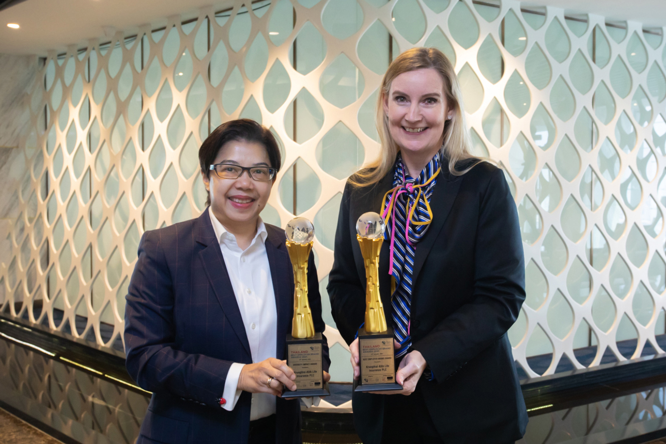 1 กุมภาพันธ์ 2564 : บมจ.กรุงไทย-แอกซ่า ประกันชีวิต นำโดย แซลลี่ โอฮาร่า ประธานเจ้าหน้าที่บริหาร (คนขวา) และ บุปผาวดี โอวรารินท์ ประธานเจ้าหน้าที่บริหาร ฝ่ายทรัพยากรบุคคล (คนซ้าย) รับ 2 รางวัล จาก World HRD Congress ประจำปี 2564 จากสาขา “Thailand Best Employer Brand Award” และ “Diversity Impact Award”