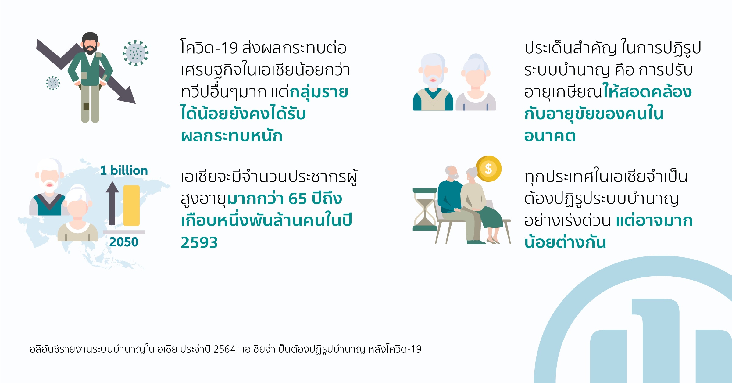 มิเคล่า กริมม์ นักเศรษฐศาสตร์อาวุโสของกลุ่มอลิอันซ์ และผู้เขียนรายงานฉบับนี้ “โควิด 19 ไม่ได้ส่งผลกระทบอย่างถาวรต่อการแก่ตัวของประชากร แต่นั่นไม่ได้หมายความว่าไม่มีผลกระทบเลยต่อระบบบำนาญทุกรูปแบบ ในทางตรงกันข้าม โควิด 19 ยิ่งทำให้ความไม่เท่าเทียมกันในสังคมที่มีอยู่แล้วแย่ลงไปอีก แผลเป็นของเศรษฐกิจถดถอย การว่างงานที่สูงขึ้น และการศึกษาที่ไม่ต่อเนื่องจะยังคงอยู่ และยังเป็นแผลที่เกิดจากมาตรการช่วยเหลืออย่างเช่น การลดหรืองดส่งเงินสมทบบำนาญ หรือการอนุญาตให้ถอนเงินบำนาญออกมาใช้ชั่วคราว มาตรการระยะสั้นเช่นนี้มีแนวโน้มที่จะทำให้เกิดความยากจนยามชราในอนาคตข้างหน้า อาจกล่าวได้ว่าโควิดเป็นตัวเร่งให้การปฏิรูประบบบำนาญจำเป็นต้องเกิดขึ้นอย่างเร่งด่วน