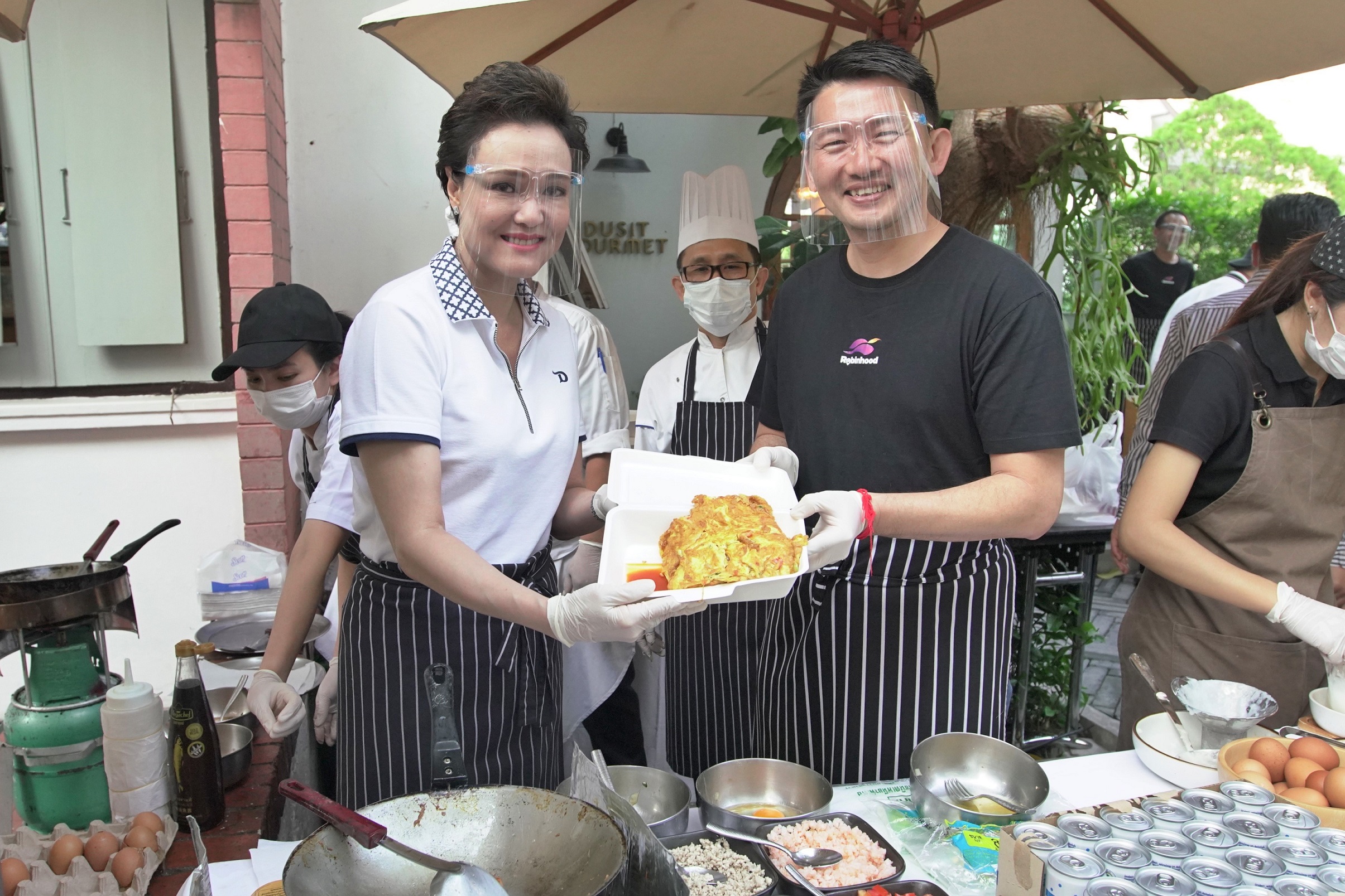 โดยโครงการฯ นี้ได้เริ่มทดลองเปิดให้บริการเมื่อสัปดาห์ที่ผ่านมา ซึ่งได้รับการตอบรับจากลูกค้าเป็นอย่างดี และเพื่อเป็นการขยายโอกาสในการเข้าถึงอาหารคุณภาพมาตรฐานโรงแรมในราคาย่อมเยา เราจึงได้ร่วมกับ “โรบินฮู้ด” นำอาหารภายใต้โครงการฯ ขึ้นแพลตฟอร์มฟู้ดเดลิเวอรี โดยเมนูหลักจากบ้านดุสิตธานี ที่จะขึ้นบนแอปพลิเคชัน โรบินฮู้ด ได้แก่ ข้าวไข่เจียว โจ๊กไข่ออนเซ็น ข้าวเหนียวหมูปิ้ง ข้าวผัดกุ้ง ข้าวราดกะเพราหมูสับ สปาเก็ตตี้ ข้าวผัดมันกุ้ง น้ำสมุนไพร พร้อมเมนูประจำวันอื่น ๆ อีกมากมาย และขนมปังที่อบสดใหม่แบบวันต่อวัน เปิดขายวันจันทร์ - วันศุกร์ ตั้งแต่เวลา 07.00 – 13.00 น.”