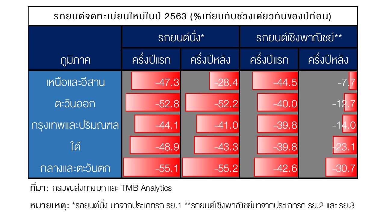 จากข้อมูลการจดทะเบียนรถใหม่ในปี 2563 พบว่ารถยนต์เชิงพาณิชย์ในภาคเหนือและภาคอีสาน ภาคตะวันออก กรุงเทพฯและปริมณฑล มียอดจดทะเบียนในครึ่งปีหลังหดตัวเพียง -7.7% -12.7% และ -14% จากครึ่งปีแรกที่หดตัวอย่างหนักกว่า -40% โดยสาเหตุที่ยอดจดทะเบียนรถยนต์เชิงพาณิชย์ทยอยปรับตัวดีขึ้นในช่วงครึ่งปีหลัง พบว่า ภาคเหนือและภาคอีสานนั้นมาจากผลผลิตข้าวปรับตัวดีขึ้น ในขณะที่ภาคตะวันออก กรุงเทพฯและปริมณฑล ได้รับอานิสงส์จากการส่งออกอาหาร อิเล็กทรอนิกส์ และเคมีภัณฑ์ที่ฟื้นตัว ตลอดจนการคลายล็อกดาวน์ทำให้กิจกรรมทางเศรษฐกิจในประเทศฟื้นตัวขึ้นบ้าง ในขณะที่ ภาคใต้และภาคกลางยังได้รับผลกระทบจากภาคการท่องเที่ยวที่ทรุดตัว