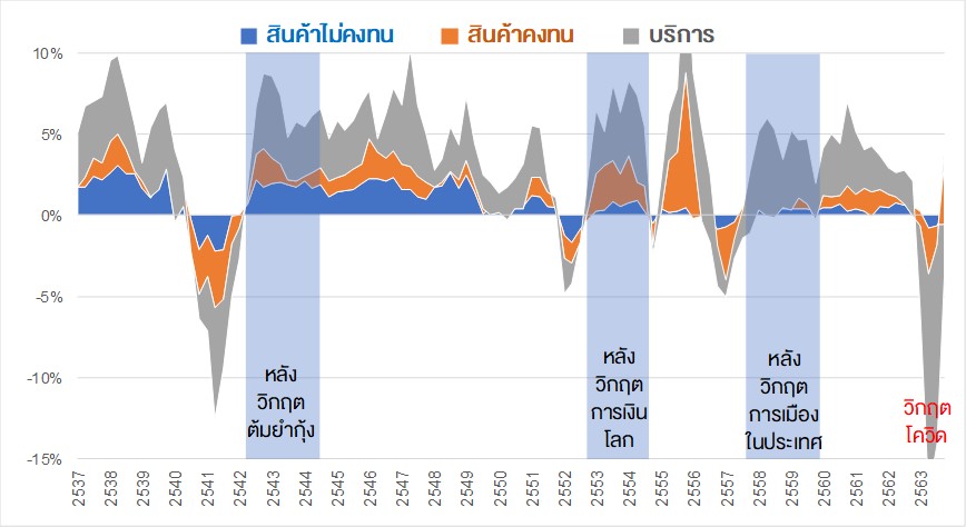 กิจกรรมทางเศรษฐกิจที่สะท้อนถึงการบริโภคภาคเอกชน โดยหลัก ๆ ประกอบด้วยการใช้จ่ายในหมวด 1) สินค้าคงทน เช่น รถยนต์ รถจักรยานยนต์ 2) สินค้าไม่คงทน ได้แก่ อาหาร เครื่องดื่ม เสื้อผ้า 3) ภาคบริการ ได้แก่ โรงแรม ค่าบริการด้านสาธารณูปโภค ซึ่งจากการวิเคราะห์ลักษณะการฟื้นตัวของการบริโภคภาคเอกชน หลังเกิดวิกฤต ได้แก่ วิกฤตต้มยำกุ้งปี 2540 วิกฤตการเงินโลกปี 2552 วิกฤตการเมืองในประเทศปี 2556-2557 และล่าสุดปี 2563 เป็นวิกฤตโควิด พบว่าลักษณะการฟื้นตัวของการบริโภคหลังวิกฤตต้มยำกุ้งและวิกฤตการเงินโลก ชี้นำโดยการเติบโตของการใช้จ่ายในภาคบริการที่ขยายตัว 8-10% และสินค้าคงทน 3-5% ขณะที่ช่วงหลังวิกฤตการเมืองในประเทศในปี 2560 พบว่าการใช้จ่ายในภาคบริการฟื้นตัวเร็วเช่นเดียวกับวิกฤตที่ผ่านๆ มา แต่การใช้จ่ายในสินค้าคงทนกลับชะลอลงมากเนื่องจากปี 2555-2556 โครงการรถคันแรกได้ดึงดีมานด์จากในอนาคตมาใช้
