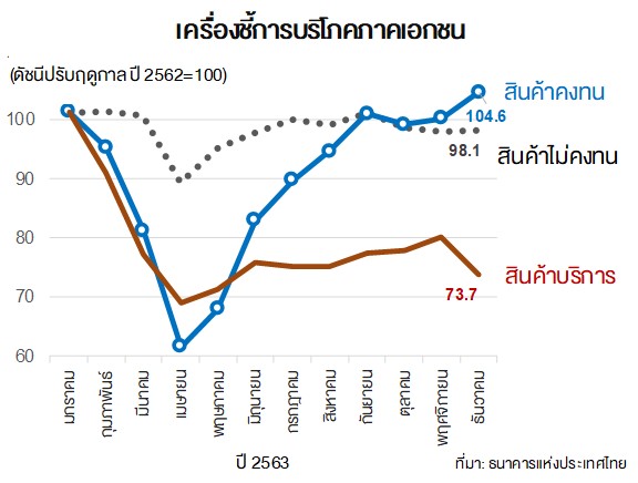สำหรับในช่วงวิกฤตโควิด-19 พบว่าในช่วงครึ่งแรกของปี 2563 ดัชนีสินค้าคงทนหดตัวถึง 20.6% แต่เริ่มพลิกขยายตัวเป็นบวกในเดือนกันยายน 2563 และขยายต่อเนื่องจนสูงกว่าค่าเฉลี่ยปี 2563 ในเดือนธันวาคม ทำให้ครึ่งหลังของปีกลับมาเป็นบวก 1.1% ขณะที่การใช้จ่ายหมวดบริการยังคงหดตัวแรง 23.8% แม้ภาครัฐออกมาตรการกระตุ้นการท่องเที่ยวในประเทศ ส่วนการใช้จ่ายสินค้าไม่คงทนอยู่ระดับประคองตัวหรือลดลง 0.7% ด้วยผลจากมาตรการเยียวยาและกระตุ้นการใช้จ่าย