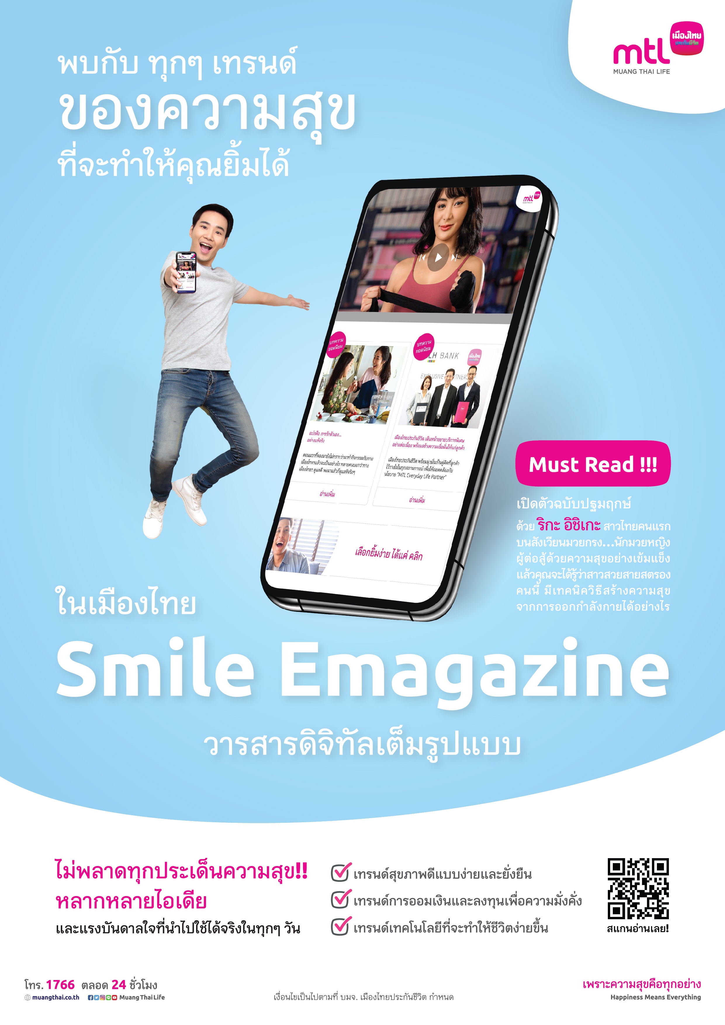 นอกจากนี้ ยังมีกิจกรรม สิทธิพิเศษ และเกมสนุกๆ ให้ลูกค้าได้เพิ่มรอยยิ้มอีกด้วย โดยลูกค้าของเมืองไทยประกันชีวิต สามารถติดตามอ่านหรือดาวน์โหลด เมืองไทย Smile Emagazine ที่จะมีการอัปเดตเทรนด์และเนื้อหาได้ที่เว็บไซต์ www.muangthai.co.th