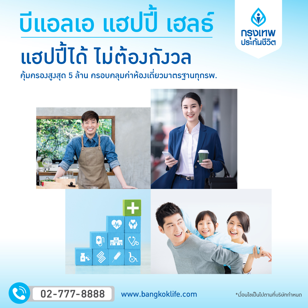 ประกันสุขภาพ บีแอลเอ แฮปปี้ เฮลธ์ คุ้มครองค่ารักษาพยาบาลสูงสุดถึงอายุ 99 ปี (รับประกันภัยตั้งแต่อายุ 11-80 ปี) ครอบคลุมค่าห้องพักเดี่ยวมาตรฐานทุกโรงพยาบาลทั่วประเทศ กรณีเจ็บป่วยหรือบาดเจ็บทั่วไป รับผลประโยชน์รวมสูงสุด 5 ล้านบาทต่อการเข้าพักรักษาตัวครั้งใดครั้งหนึ่ง กรณีเข้าพักรักษาตัวจากโรคมะเร็ง โรคหัวใจ หรือโรคหลอดเลือดสมอง รับผลประโยชน์รวมสูงสุดเพิ่มเป็น 5.5 ล้านบาท (ขึ้นอยู่กับแผนประกันที่เลือก)