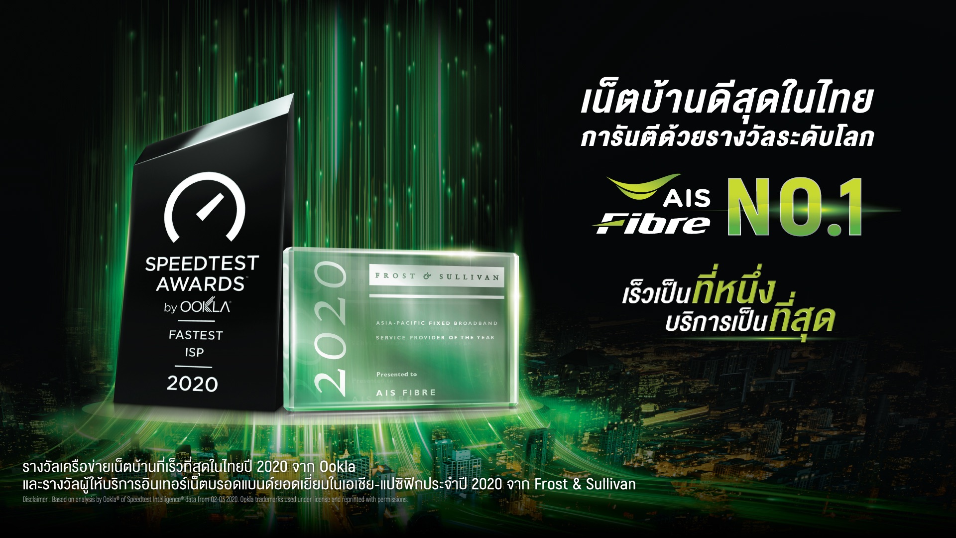 พร้อมทั้งเป็นแอปสปีดเทสที่คนไทยนิยมใช้มากที่สุดประกาศให้ AIS Fibre ได้รับรางวัล เครือข่ายอินเทอร์เน็ตบ้านที่เร็วที่สุด ในประเทศไทย -Thailand’s Fastest ISP 2 ปีซ้อน (ปี 2019-2020) โดยผลล่าสุด ในปี 2020 AIS Fibre ยังคงเป็นอันดับหนึ่ง ด้วยคะแนนความเร็วในการให้บริการอินเทอร์เน็ต Speed Score 137.94 ความเร็วเฉลี่ยการดาวน์โหลด 407.81 Mbps ความเร็วเฉลี่ยการอัปโหลด 299.44 Mbps
