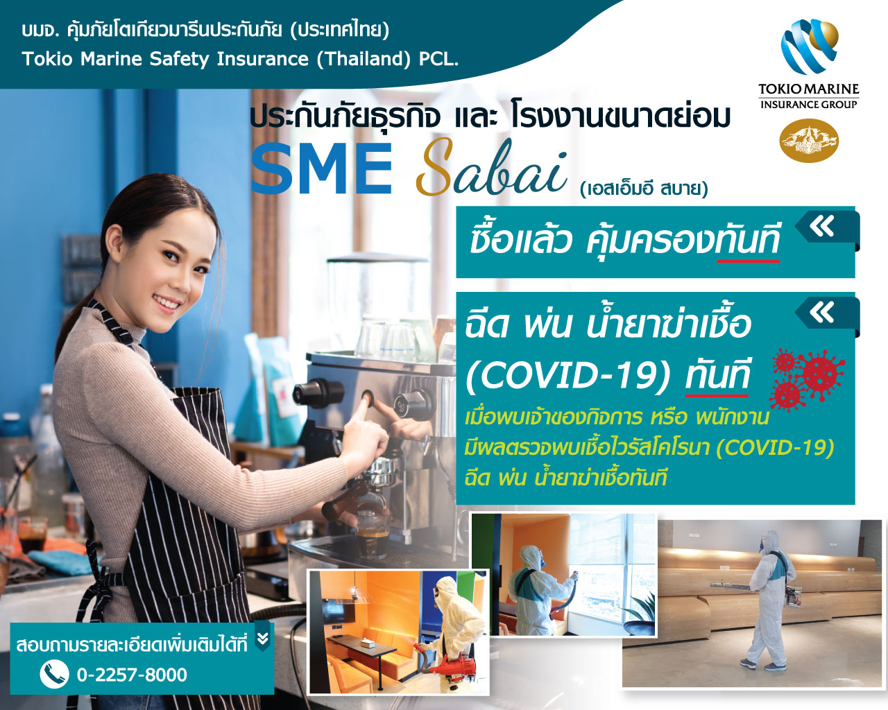 นอกจากนี้ “เอสเอ็มอี สบาย’’ จากคุ้มภัยโตเกียวมารีนฯ ยังเป็นเจ้าแรกของเมืองไทย ที่มอบความคุ้มครองพิเศษ บริการฉีดพ่นน้ำยาฆ่าเชื้อโควิด-19 ทันที กรณีผู้ประกอบการหรือพนักงานมีผลตรวจพบเชื้อโควิด-19 ด้วยเบี้ยเริ่มต้นเพียงวันละ 5 บาท ให้ความคุ้มครองสูงสุดถึง 50,000,000 ล้านบาท