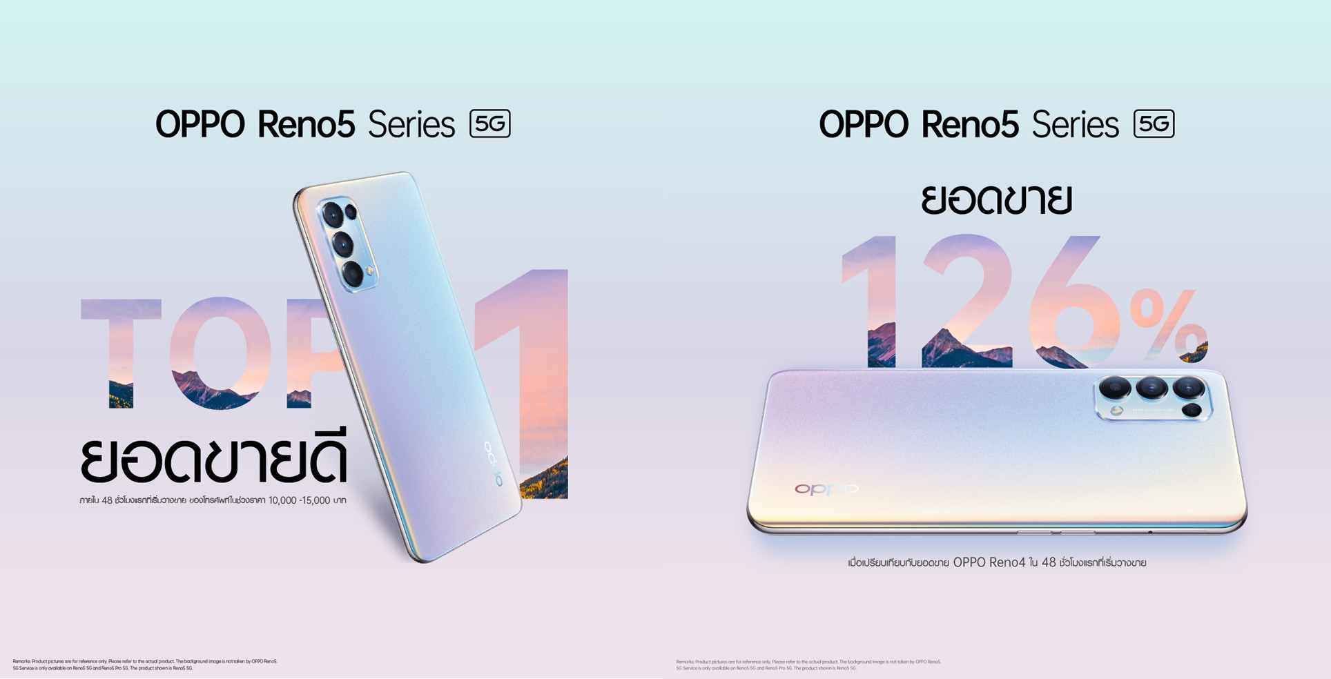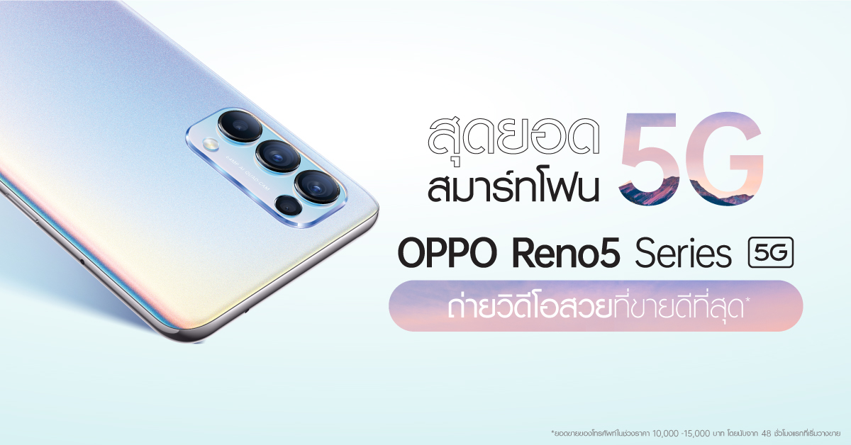 OPPO Reno5 Series 5G มาพร้อมคอนเซ็ปต์ “Picture Life Together” กับการได้รับกระแสตอบรับอย่างล้นหลามทั้งจากสื่อมวลชนและกลุ่มลูกค้า ตั้งแต่จัดงานเปิดตัวแบบออนไลน์เมื่อปลายเดือนที่ผ่านมา จนกระทั่งเปิดวางจำหน่ายอย่างเป็นทางการก็ได้รับยอดขายอันดับ 1 ในตลาดสมาร์ทโฟนระดับกลางในช่วงราคา 10,000 – 15,000 บาทภายใน 48 ชั่วโมงแรก พร้อมยอดขาย 120% เมื่อเทียบกับรุ่นก่อนหน้า ขึ้นแท่นเป็นสมาร์ทโฟน 5G ที่ถ่ายวิดีโอ Portrait ได้สวยที่สุดและมียอดขายดีที่สุด