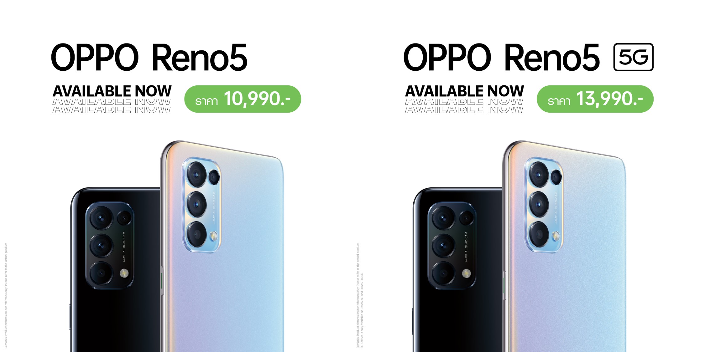 เป็นเจ้าของ OPPO Reno5 Series 5G ได้แล้ววันนี้ทั้ง 2 รุ่น ได้แก่ OPPO Reno5 ในราคา 10,990 บาท มีให้เลือก 2 สี คือ สีเงิน Fantasy Silver และสีดำ Starry Black และ OPPO Reno5 5G ในราคา 13,990 บาท มีให้เลือก 2 สี คือ สีเงิน Galactic Silver และสีดำ Starry Black ที่ OPPO Brand Shop ทุกสาขา และตัวแทนจำหน่ายทั่วประเทศ