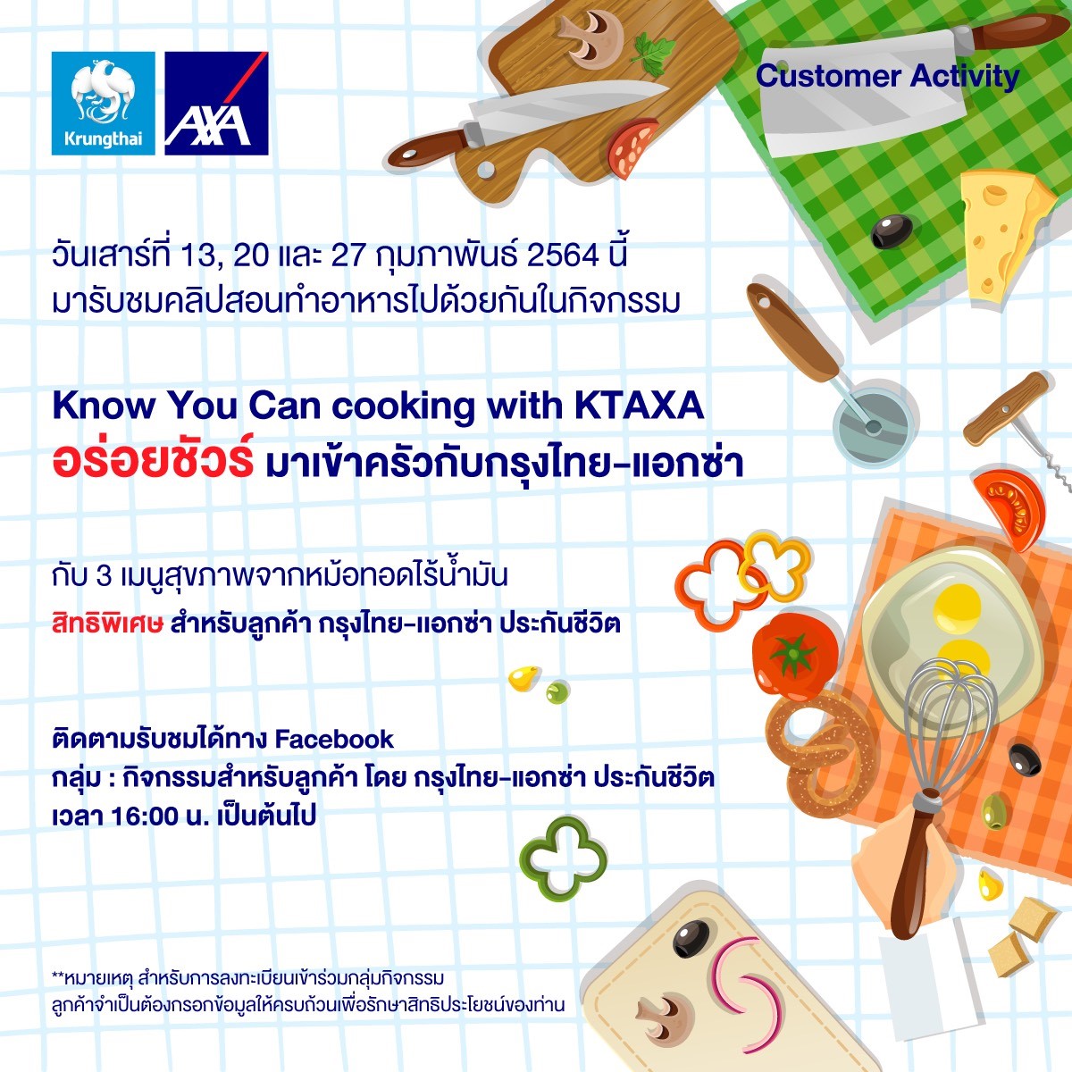 10 กุมภาพันธ์ 2564 : บมจ.กรุงไทย-แอกซ่า ประกันชีวิต เชิญชวนคนรักการทำอาหารและสุขภาพร่วมเปิดประสบการณ์ใหม่กับกิจกรรม “Know You Can cooking with KTAXA อร่อยชัวร์ มาเข้าครัวกับกรุงไทย-แอกซ่า” กับการรังสรรค์ 3 เมนูสุขภาพจากหม้อทอดไร้น้ำมัน