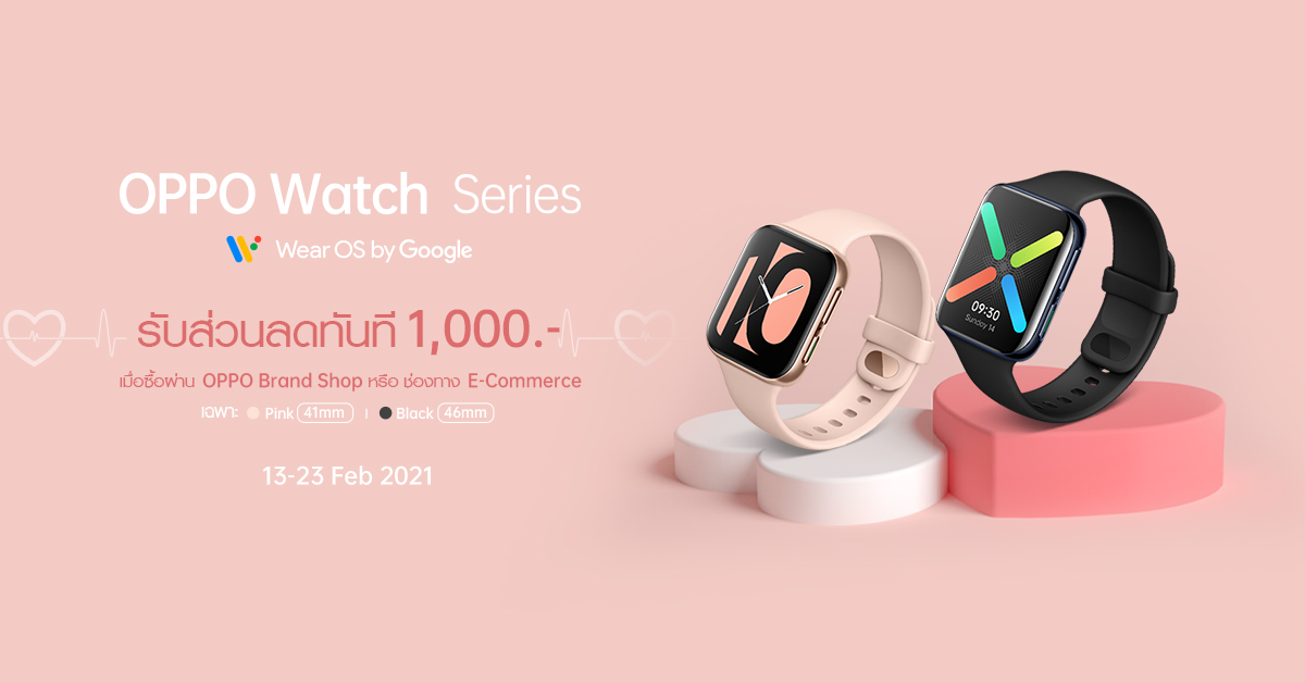 15 กุมภาพันธ์ 2564 : OPPO ต้อนรับวันวาเลนไทน์ ด้วยโปรโมชั่นสุดฮอตของ OPPO Watch Series สมาร์ทวอร์ชรุ่นแรก ภายใต้สโลแกน “เชื่อมต่อทุกไลฟ์สไตล์ที่เป็นคุณ” ด้วยส่วนลด 1,000 บาท เมื่อซื้อ OPPO Watch 41mm สี Pink Gold หรือ OPPO Watch 46mm สี Black ที่ OPPO Brand Shop และ ช่องทางออนไลน์ที่ร่วมรายการ