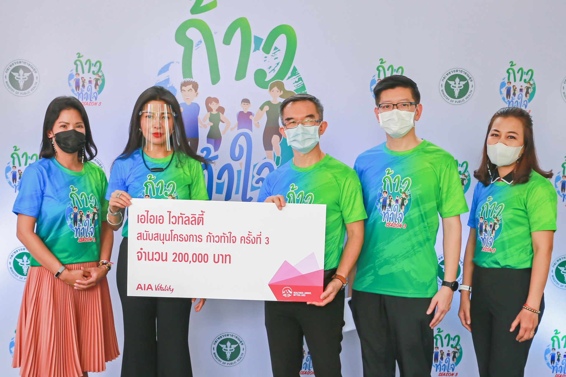 18 กุมภาพันธ์ 2564 : เอไอเอ ประเทศไทย นำโดย รพีพร วงศ์ทองคำ (ที่ 2 จากซ้าย) ผู้อำนวยการฝ่ายสื่อสารองค์กรและภาพลักษณ์ ร่วมงานแถลงข่าว โครงการ “ก้าวท้าใจ Season 3” พิชิต 100 วัน 100 กิโลเมตร ต้านภัยโควิด-19 พร้อมสนับสนุนของรางวัลในโครงการ มูลค่า 200,000 บาท โดยมี นายแพทย์บัญชา ค้าของ (กลาง) รองอธิบดีกรมอนามัย และ นายแพทย์อุดม อัศวุตมางกุร (ที่ 2 จากขวา) ผอ.กองกิจกรรมทางกายเพื่อสุขภาพ กรมอนามัย กระทรวงสาธารณสุข เป็นผู้รับมอบ ทั้งนี้ เอไอเอ มีความมุ่งมั่นที่จะช่วยสนับสนุนคนไทยให้มีสุขภาพและชีวิตที่ดีขึ้น ผ่านการออกกำลังกายทุกรูปแบบ ดั่งคำมั่นสัญญา “Healthier, Longer, Better Lives” ![]()
