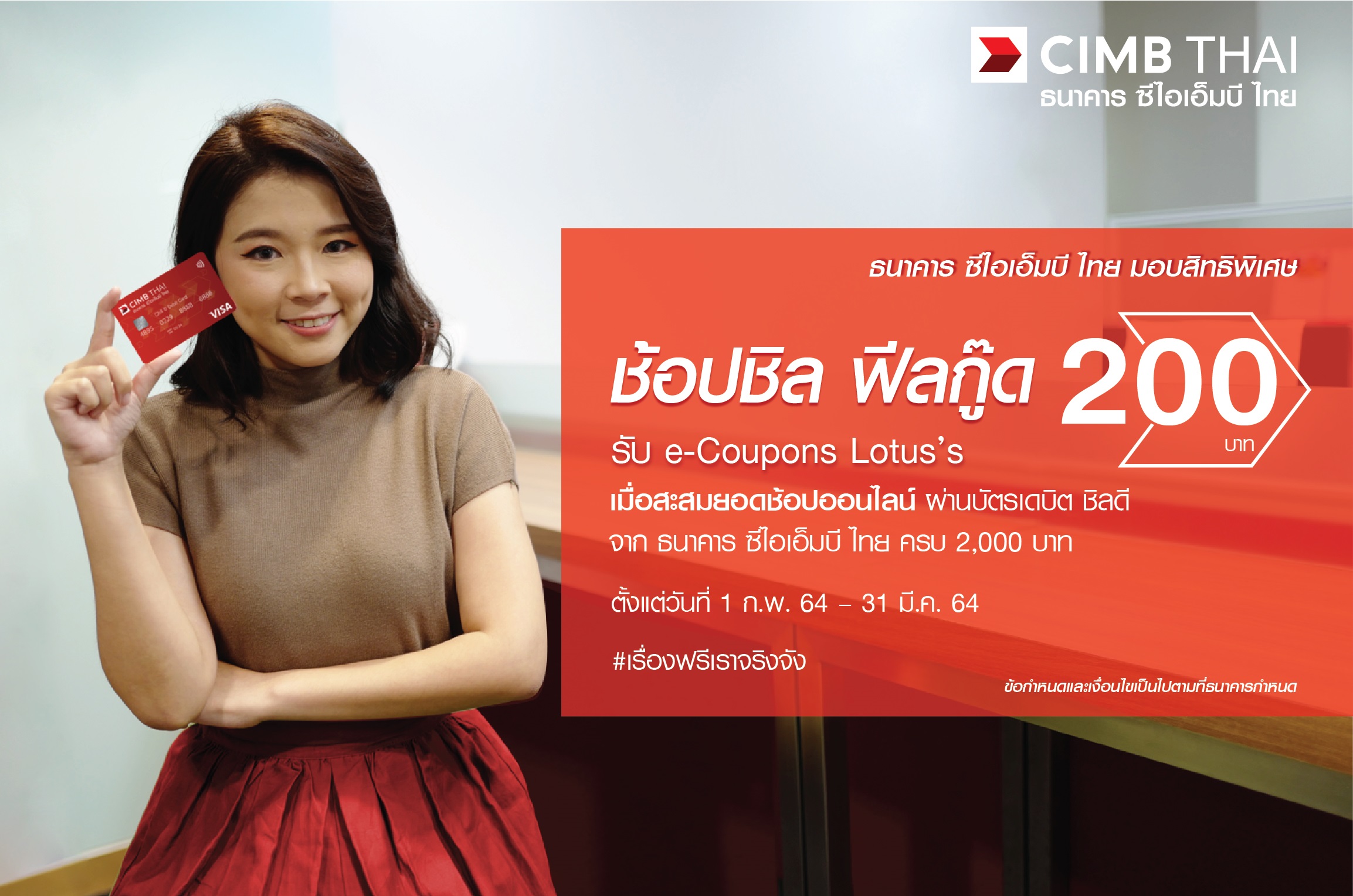 23 กุมภาพันธ์ 2564 : ธนาคาร ซีไอเอ็มบี ไทย มอบสิทธิพิเศษแด่ลูกค้าที่ สะสมยอดช้อปสินค้าต่างๆ ผ่านช่องทางออนไลน์ ด้วยบัตรเดบิต ชิลดี จากธนาคาร ซีไอเอ็มบี ไทย ครบ 2,000 บาทต่อเดือน รับฟรี e-Coupons Lotus’s 200 บาท เพียงลูกค้าลงทะเบียนรับสิทธิ์ผ่านช่องทาง Line official account “@cimbthai” (ลงทะเบียนรับสิทธิ์ https://bcrm.line.me/wl/1644250669/l/9ecb) โดยจำกัด 1 สิทธิ์ต่อ 1 หมายเลขบัตรเดบิต ชิลดี ต่อเดือน และ 1,000 สิทธิ์ตลอดรายการส่งเสริมการขาย ตั้งแต่วันที่ 1 ก.พ.64 – 31 มี.ค.64
