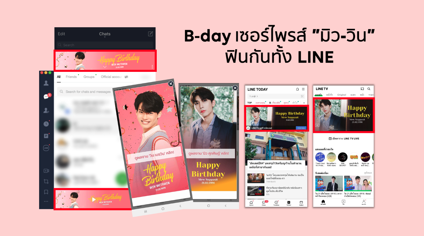 วันนี้ ด้อมไทยมาสู่มิติใหม่ของความฟิน ด้วยป้ายโฆษณาแบนเนอร์อวยพรวันเกิดสุดอลังทั่วพื้นที่ LINE เรียกได้ว่า จะหน้าแชทไลน์คุยกับเพื่อน จะเข้าดูซีรี่ส์ รายการสนุกอื่นๆ บน LINE TV หรืออ่านข่าว คอนเทนต์ดีๆ บน LINE TODAY ก็ต้องเห็นผ่านตากันแทบทุกคน! นับเป็นครั้งแรกของโลกออนไลน์ ที่ให้แฟนด้อมได้กรี๊ดและฟินกันเต็มๆ แบบติดตัวตลอดเวลา ด้วยแบนเนอร์สุดคิ้วท์ที่ขึ้นทุกช่องทางบนโลกของ LINE กุมหัวใจแฟนคลับให้ฟินกันยาวๆ ทั้งวัน แถมถ้าใครอยากฟินแบบคูณสองก็เปิดทั้งแล็ปท็อปและสมาร์ทโฟนก็ได้ เปิดไลน์ที่ไหน อวยพรทั้งใจให้ไปทุกหน้าจอกันเลยทีเดียว!