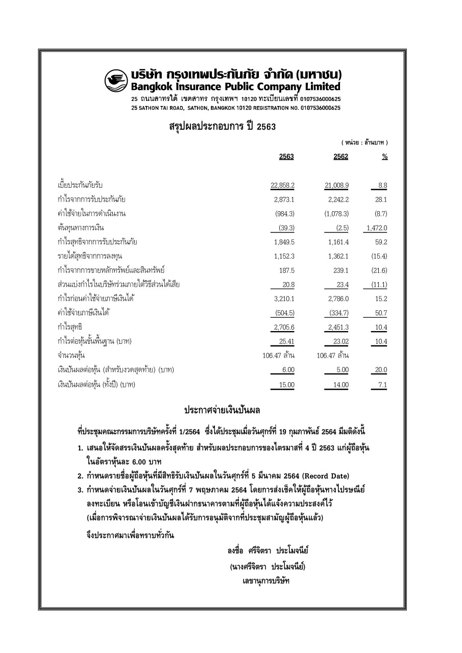 24 กุมภาพันธ์ 2564 : กรุงเทพประกันภัยโชว์ผลงานปี 2563 ยืนยันความแข็งแกร่งด้วยเบี้ยประกันภัยรับรวม 22,858.2 ล้านบาท เติบโตจากปีก่อนร้อยละ 8.8 มีกำไรสุทธิ 2,705.6 ล้านบาท เพิ่มขึ้นถึงร้อยละ 10.4