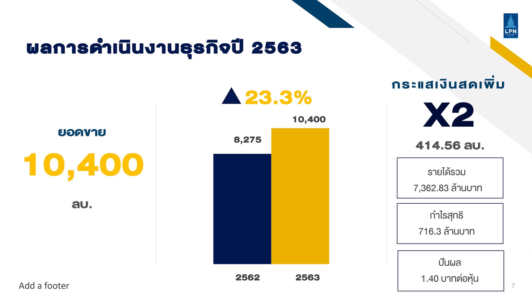 ทั้งนี้ ณ สิ้นปี 2563 บริษัทมียอดขายรอโอน (Backlog) ประมาณ 2,200 ล้านบาท ที่จะรับรู้รายได้ในปี 2564 และมีสินค้าคงเหลือที่พร้อมขายประมาณ 11,000 ล้านบาท