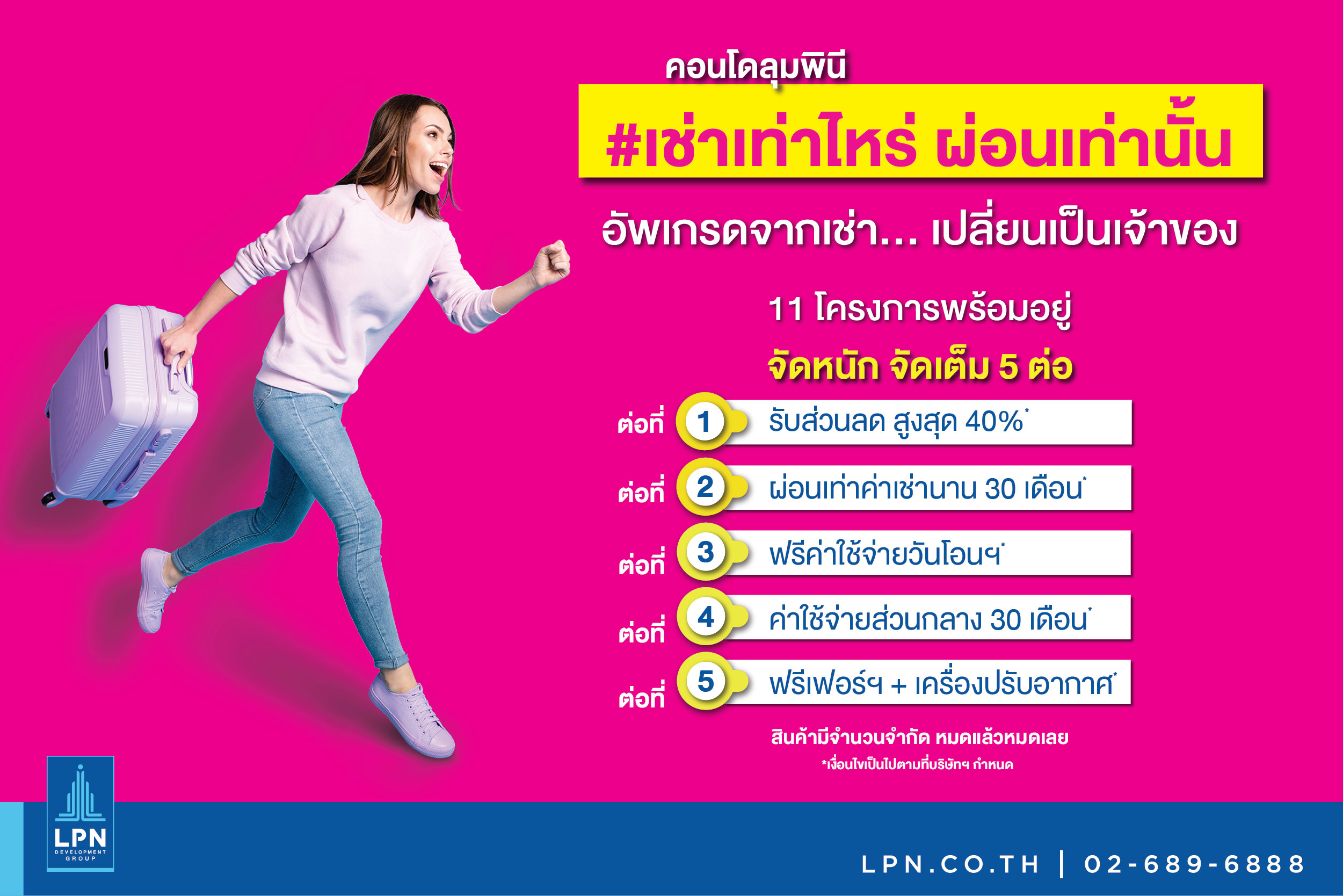 3 มีนาคม 2564 : บริษัท แอล.พี.เอ็น.ดีเวลลอปเมนท์ จำกัด(มหาชน)(LPN) ส่งเสริมคนไทยมีบ้านเป็นของตัวเอง เปลี่ยนจากค่าเช่าบ้านเป็นค่าผ่อนบ้านแทน สร้างโอกาสให้คนไทยมีบ้านได้ง่ายขึ้นในราคาที่จับต้องได้ (Affordable Price) ด้วยแคมเปญใหม่ “#เช่าเท่าไหร่ ผ่อนเท่านั้น” โดย LPN จะช่วยลูกค้าผ่อนค่างวดกับสถาบันการเงินเป็นเวลา 30 เดือน เริ่มตั้งแต่ 3,200-13,000 บาท ขึ้นอยู่กับทำเลที่ตั้งของคอนโดมิเนียมทั้ง 11 โครงการ ที่เข้าร่วมแคมเปญ