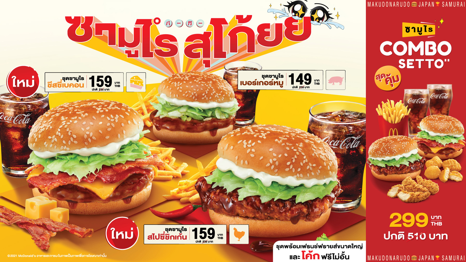 3 มีนาคม 2564 : แมคโดนัลด์ เสิร์ฟความฟินที่ไทยได้ฟีลลิ่งเหมือนอยู่ญี่ปุ่นกับชุด ‘ซามูไรสุโก้ยย’ เลือกอร่อยได้ 3 สไตล์ ฟินสุโก้ยยกับเมนูใหม่ล่าสุด ‘ซามูไร ชีสซี่เบคอน’ (Cheesy Bacon Teriyaki Pork Burger) อร่อยเต็มคำกับเนื้อหมูนุ่มๆ ชุ่มซอส เทอริยากิเข้มข้น ผสานความหอมของชีสเต็มแผ่นจากนิวซีแลนด์ เบคอนกรุบกรอบ และผักกาดแก้วสดฉ่ำ ชื่นชอบความสุโก้ยแบบร้อนแรงต้องลอง