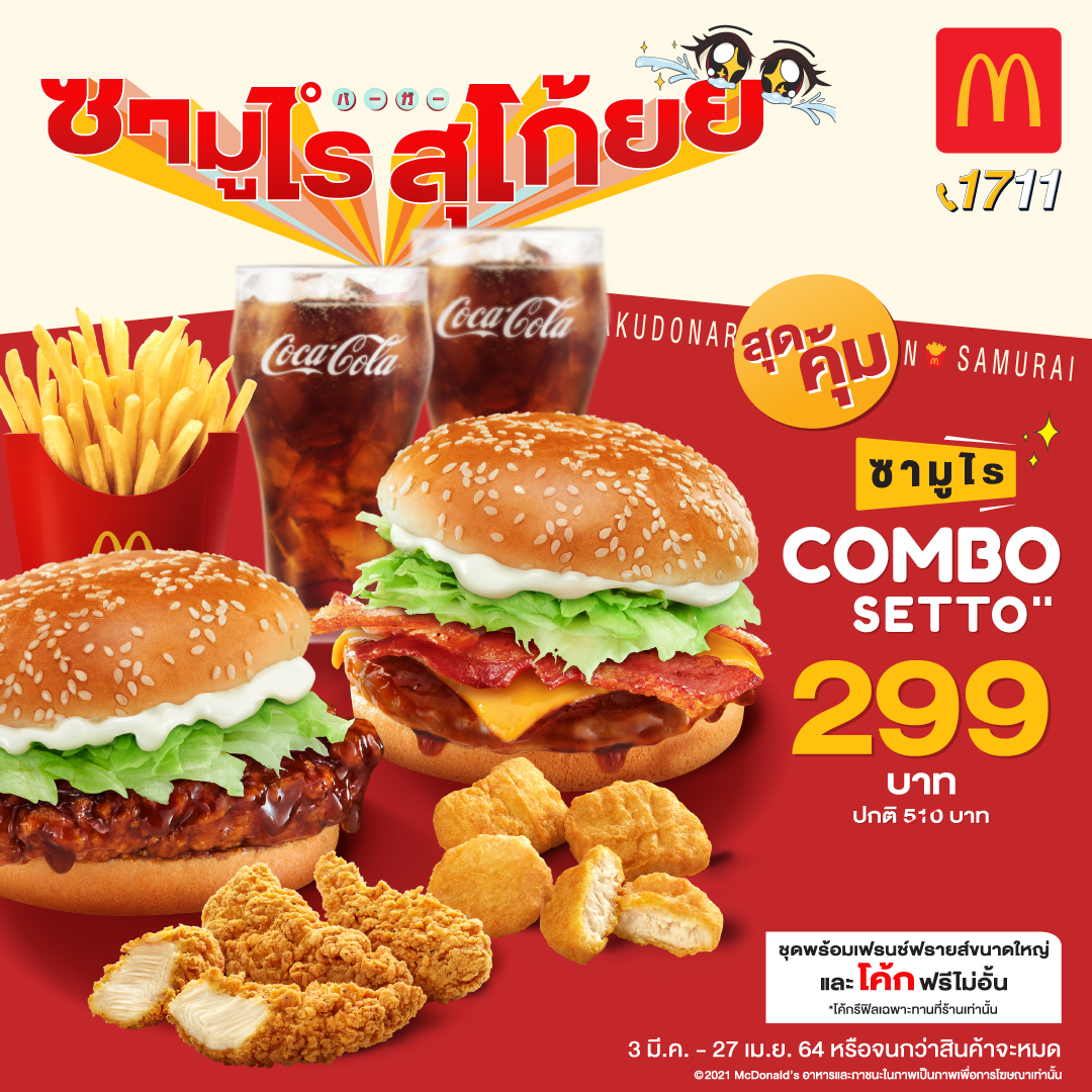 เต็มอิ่มชุดใหญ่ สุโก้ยยยยกแก๊งกับ ‘ซามูไร คอมโบ้ เซตโตะ’ (Samurai Combo Setto) คุ้มสุดทั้ง ซามูไร ชีสซี่เบคอน 1 ชิ้น, ซามูไร สไปซี่ชิกเก้น 1 ชิ้น, แมคนักเก็ต 4 ชิ้น, ไก่ไม่มีกระดูก 3 ชิ้น, เฟรนช์ฟรายส์ขนาดกลาง 1 กล่อง และโค้กรีฟิล 16 ออนซ์ 2 แก้วพิเศษเพียง 299 บาท (ปกติเริ่มต้น 510 บาท) เริ่ม 3 มีนาคม – 27 เมษายน 2564 หรือจนกว่าสินค้าจะหมด ที่ร้านแมคโดนัลด์ทุกสาขาที่ร่วมรายการ* ทั้งรับประทานที่ร้าน ซื้อกลับบ้าน ไดร์ฟ ทรู และ แมคดิลิเวอรี