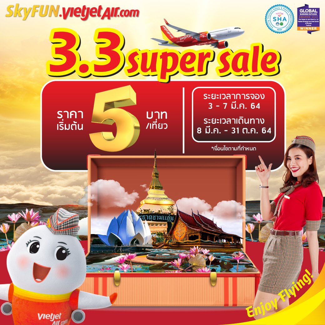 กรุงเทพฯ, 3 มีนาคม 2564 : สายการบินไทยเวียตเจ็ท ฉลองมหกรรม 3.3 ออกโปรโมชั่น “3.3 ซูเปอร์ เซลล์” (3.3 Super Sale) เสนอตั๋วโดยสารราคาพิเศษ เริ่มต้นเพียง 5 บาท (ไม่รวมภาษี ค่าธรรมเนียม และค่าบริการเพิ่มเติม) สำหรับเดินทางในทุกเส้นทางบินภายในประเทศของสายการบินฯ จองได้ตั้งแต่วันที่ 3 – 7 มีนาคม 2564 เดินทางได้ระหว่างวันที่ 8 มีนาคม – 31 ตุลาคม 2564 (ยกเว้นวันหยุกนักขัตฤกษ์) ที่ SkyFUN.vietjetair.com