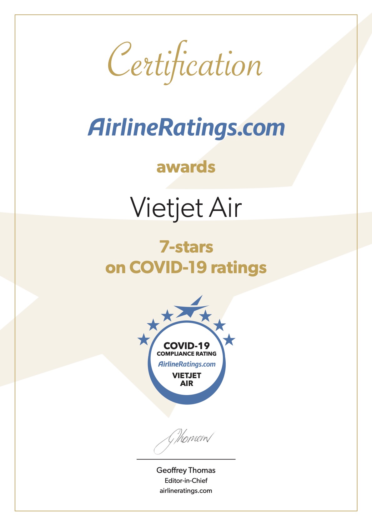 5 มีนาคม 2564 : สายการบินเวียตเจ็ทได้รับการจัดอันดับด้านความปลอดภัยระดับ 7 ดาว ซึ่งเป็นระดับสูงสุด จากเว็บไซต์แอร์ไลน์เรตติ้งส์ (AirlineRatings) จากการดำเนินงานที่ยอดเยี่ยมในการรับมือกับโรคไวรัสโคโรน่า 2019 (COVID-19) โดยได้รับการจัดอันดับระดับ 7 ดาวเป็นปีที่สามติดต่อกัน