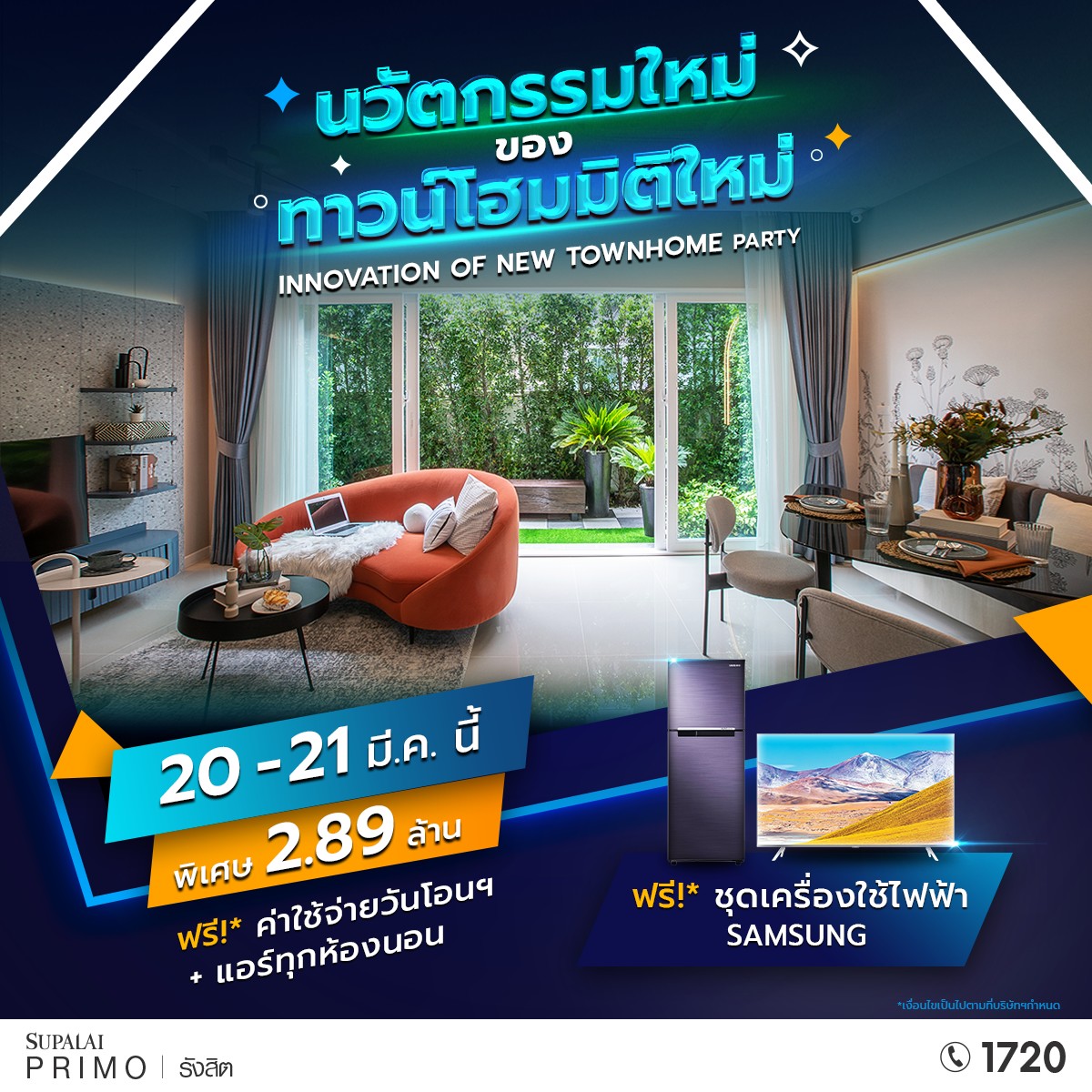 พิเศษสุดคุ้มกับโปรโมชั่น!! เมื่อจองบ้านภายในงาน รับฟรี 1.ชุดเครื่องใช้ไฟฟ้า จาก SAMSUNG* 2.ค่าใช้จ่ายวันโอนฯ 3.ค่าส่วนกลาง 4.แอร์ทุกห้องนอน* กู้ไม่ผ่านยินดีคืนเงิน พร้อมตอบรับมาตราการรัฐ ลดค่าโอนและจดจำนอง ให้เพิ่ม Central gift card มูลค่า 40,000 บาท (เฉพาะทาวน์โฮมราคาไม่เกิน 3 ล้านบาท) ลงทะเบียนเพื่อรับส่วนลดสูงสุด 200,000 บาท ได้ที่ http://bit.ly/3sIB4yF