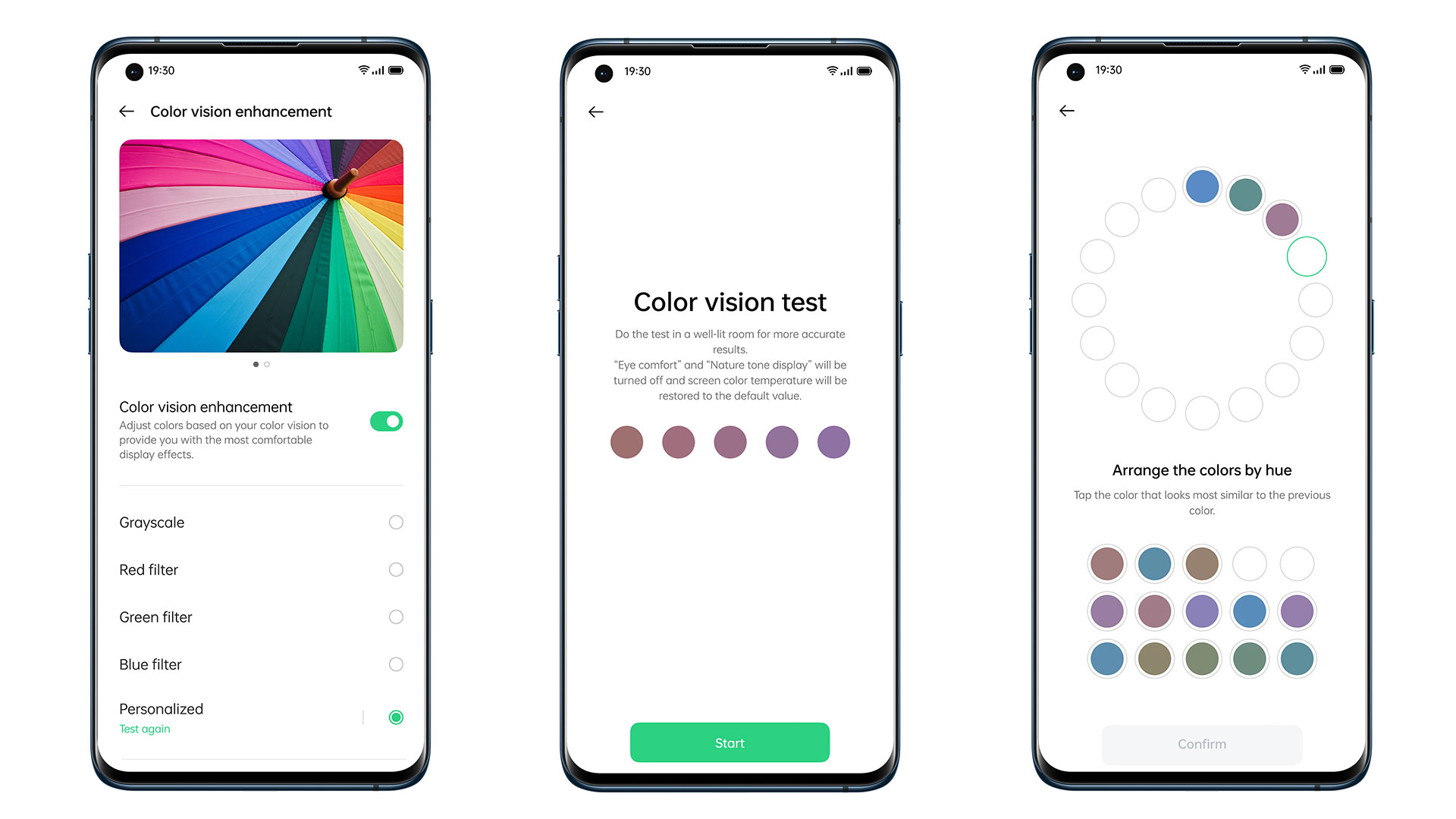 ความบกพร่องด้านการมองเห็นสี เกิดขึ้นในผู้ชาย 1 ต่อ 12 คน และเกิดขึ้นในผู้หญิง 1 ต่อ 200 คน ด้วย Colour Vision Enhancement ซึ่งเป็นส่วนหนึ่งของ ColorOS 11.2 ทำให้ OPPO ได้พัฒนาเวอร์ชั่นจากการทดสอบ Munsell 100 Hue Test ที่สามารถปรับเปลี่ยนสีสันของหน้าจอได้มากถึง 765 แบบ พร้อมปรับแต่งสีที่เหมาะสมที่สุดสำหรับดวงตาของผู้ใช้ OPPO Find X3 Series ทุกคน