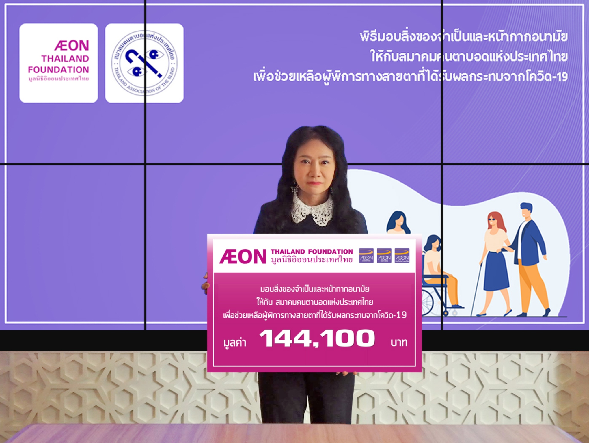18 มีนาคม 2564 : คุณสุพร วัธนเวคิน ประธานกรรมการมูลนิธิอิออนประเทศไทย มอบสิ่งของที่จำเป็นและหน้ากากอนามัย บรรจุในถุงยังชีพ จำนวน 200 ถุง มูลค่ารวม 144,100 บาท ให้แก่สมาคมคนตาบอดแห่งประเทศไทย โดยมีกรรมการสมาคมฯ เป็นตัวแทนรับมอบ เพื่อนำไปช่วยเหลือผู้พิการทางสายตาทั่วประเทศ ที่ได้รับผลกระทบจากการแพร่ระบาดของไวรัสโควิด-19 ทำให้ไม่สามารถประกอบอาชีพเพื่อหารายได้ได้ตามปกติ โดยทางสมาคมฯ จะจัดส่งไปยังบ้านของผู้พิการทางสายตา ตามที่ได้แจ้งขอความช่วยเหลือมา ![]()