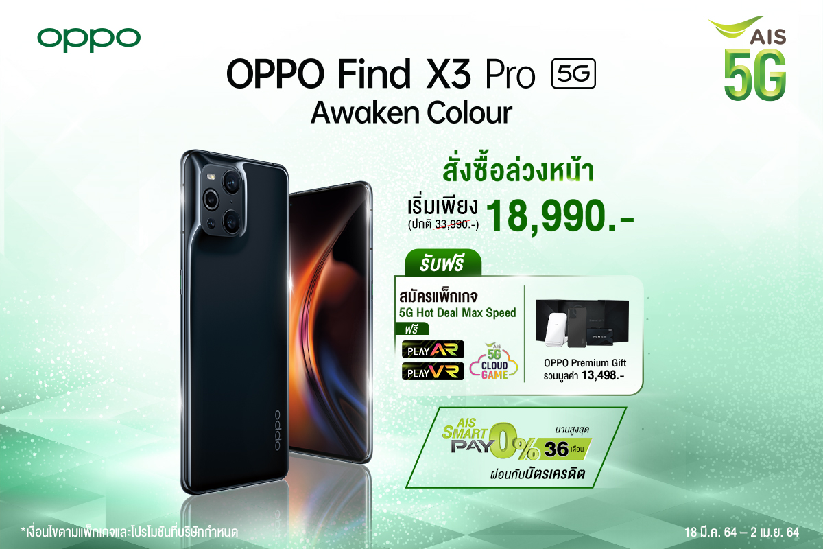OPPO Find X3 Pro 5G เริ่มต้นเพียง 18,990 บาท จากราคาปกติ 33,990 บาท เมื่อสมัครแพ็คเกจรายเดือนกับ AIS เพียงเดือนละ 1,699 บาท โดยเปิดให้จองตั้งแต่ 18 มีนาคม เวลา 19.00 น. ถึง 2 เมษายน 2564 ที่เอไอเอสช็อป และ ร้านเทเลวิซทุกสาขา นอกจากข้อเสนอและโปรโมชั่นสุดคุ้มจากทาง AIS แล้วของสมนาคุณจาก OPPO ก็คุ้มสุดคุ้ม ทั้ง OPPO AirVOOC Wireless Charger 45W, KEVLAR Case และ Premium Service Card รับสิทธิรับประกัน International warranty service ซ่อมทั้งในและต่างประเทศ, เพิ่มความจุของ OPPO Cloud Service 1TB ในจำนวนจำกัด และ สิทธิรับประกันตัวเครื่องถึง 2 ปี มูลค่ารวม 13,498 บาท โดยของสมนาคุณมีจำนวนจำกัด