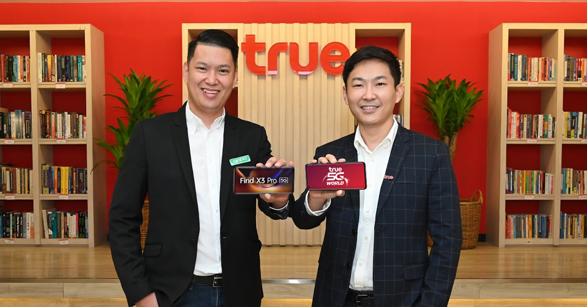 19 มีนาคม 2564 : ทรู 5G โดย ตฤณ สิทธิอนันต์วงศ์ (ขวา) รองผู้อำนวยการด้านบริหารผลิตภัณฑ์ดีไวซ์ บมจ. ทรู คอร์ปอเรชั่น ร่วมกับ ออปโป้ โดย ชานนท์ จิรายุกุล (ซ้าย) ประธานกรรมการอาวุโสฝ่ายบริหาร ออปโป้แห่งประเทศไทย ชวนเปิดประสบการณ์แห่งพันล้านสีกับสุดยอดสมาร์ทโฟนรุ่นใหม่ OPPO Find X3 Pro 5G ภายใต้สโลแกน “Awaken Colour” บนเครือข่ายอัจฉริยะ ทรู 5G เร็วกว่า แรงกว่า รายแรก รายเดียวที่ครบสุดทุกย่านความถี่ ครอบคลุมทุกการใช้งาน ด้วยราคาเริ่มต้นเพียง 16,990 บาท (ปกติ 33,990 บาท) เมื่อย้ายค่ายเบอร์เดิมมาทรูมูฟ เอช