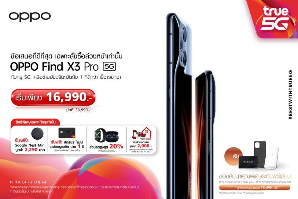 พร้อมรับฟรี! เป็นเจ้าของสมาร์ทโฟนสุดล้ำได้ตั้งแต่วันที่ 18 มี.ค. – 2 เม.ย. นี้ ที่ www.truemoveh.com/oppofindx3pro/preorder ทรูช็อปทุกสาขาทั่วประเทศ, เว็บ True Store และ LINE@ True Store โดยสามารถรับสินค้าได้ตั้งแต่วันที่ 3 เม.ย. 64 – 18 เม.ย. 64 ที่ทรูช็อป สาขาที่เลือกไว้