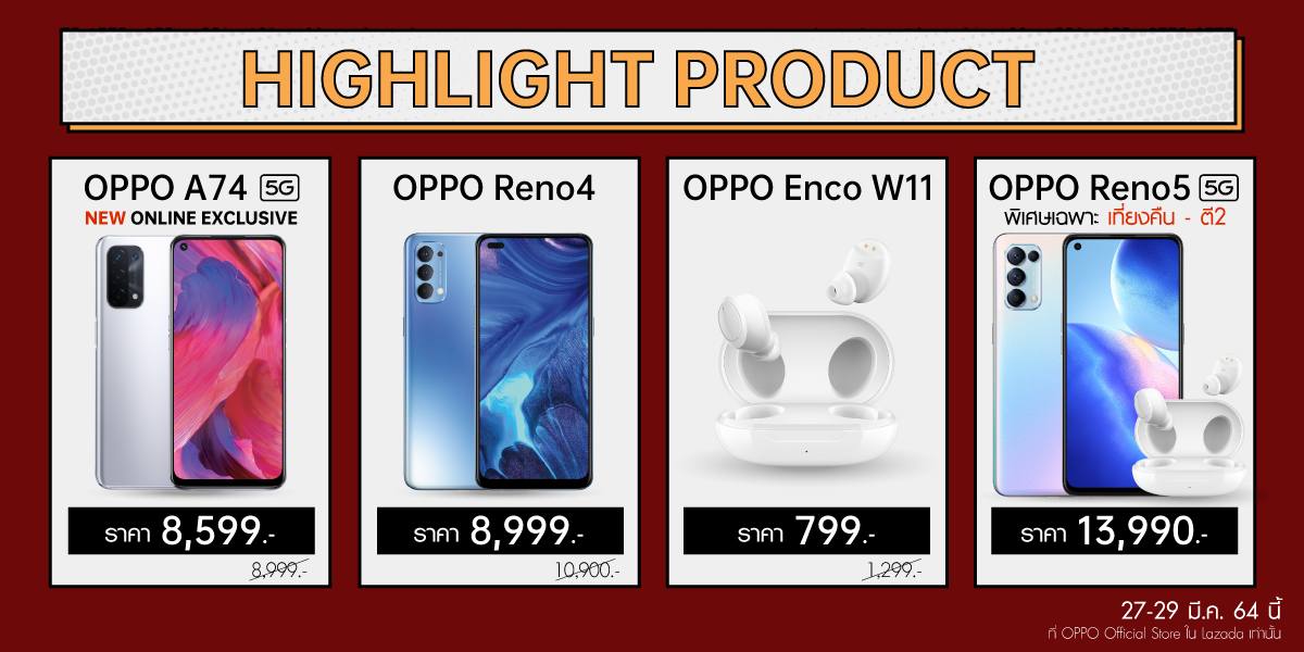 OPPO Enco W31 พิเศษ 1,299 บาท จากปกติ 1,999 บาทOPPO Enco W11 พิเศษ 799 บาท จากปกติ 1,299 บาทOPPO Band สมาร์ทแบรนด์จัดเต็มด้านสุขภาพรุ่นใหม่ล่าสุด พิเศษ 999 บาท จากปกติ 1,199 บาทOPPO Watch Series สมาร์ทวอทซ์รุ่นแรกจาก OPPO รับฟรี! สาย OPPO Watch สุดคูล มูลค่า 599 บาท โดยของสมนาคุณมีจำนวนจำกัด หรือ รับของแถมเพิ่มทันที! เมื่อซื้อสมาร์ทโฟน ในช่วงเวลา เที่ยงคืน – 02:00 ของวันที่ 27 มีนาคม 2564