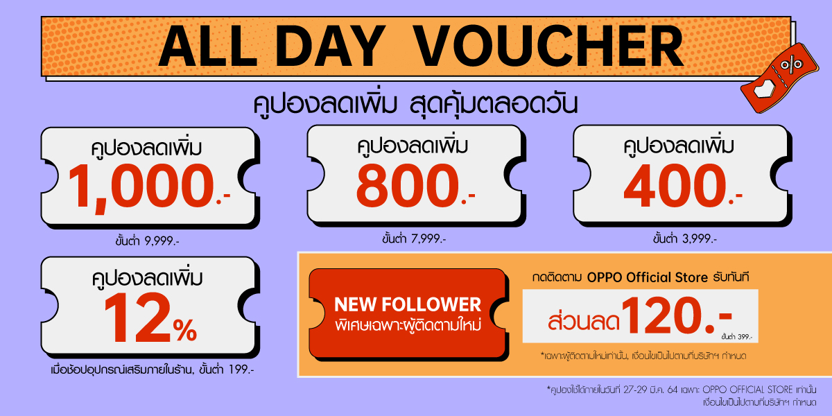 โดยสามารถลดได้สูงสุด 500 บาท คูปองมีจำนวนจำกัด โดยสามารถเก็บคูปองได้ในเวลา 0.00 – 23.59 ของวันที่ 27 มีนาคม 2564 และ เวลา 12.00 – 23.59 ของวันที่ 28 -29 มีนาคม 2564Follow us! Voucher คูปองพิเศษเมื่อติดตาม OPPO Official Store ที่ Lazada ในวันที่ 20 – 29 มีนาคม 2564รับฟรี! คูปองส่วนลด 120 บาท เมื่อซื้อขั้นต่ำ 399 บาท โดยสามารถใช้คูปองได้เฉพาะวันที่ 27 – 29 มีนาคม 2564 เท่านั้น