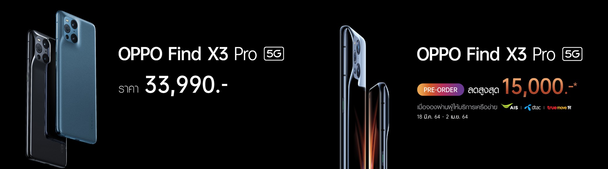 สำหรับผู้ที่สนใจสามารถพรีออเดอร์ OPPO Find X3 Pro 5G สมาร์ทโฟนแฟล็กชิพที่สุดแห่งพันล้านสี ในราคา 33,990 บาท ตั้งแต่วันนี้ – 2 เมษายน 2564 รับฟรี! OPPO AirVOOC Wireless Charger 45W, KEVLAR Case และ Premium Card ที่มาพร้อมสิทธิรับประกัน International warranty service ซ่อมฟรีทั้งในและต่างประเทศ, รับความจุของ OPPO Cloud Service เพิ่มเป็น 1TB ในจำนวนจำกัด และสิทธิรับประกันตัวเครื่องถึง 2 ปี มูลค่ารวม 13,498 บาท หรือ พิเศษสำหรับผู้ที่พรีออเดอร์ OPPO Find X3 Pro 5G ผ่านผู้ให้บริการเครือข่ายรับส่วนลดสูงสุด 15,000 บาท