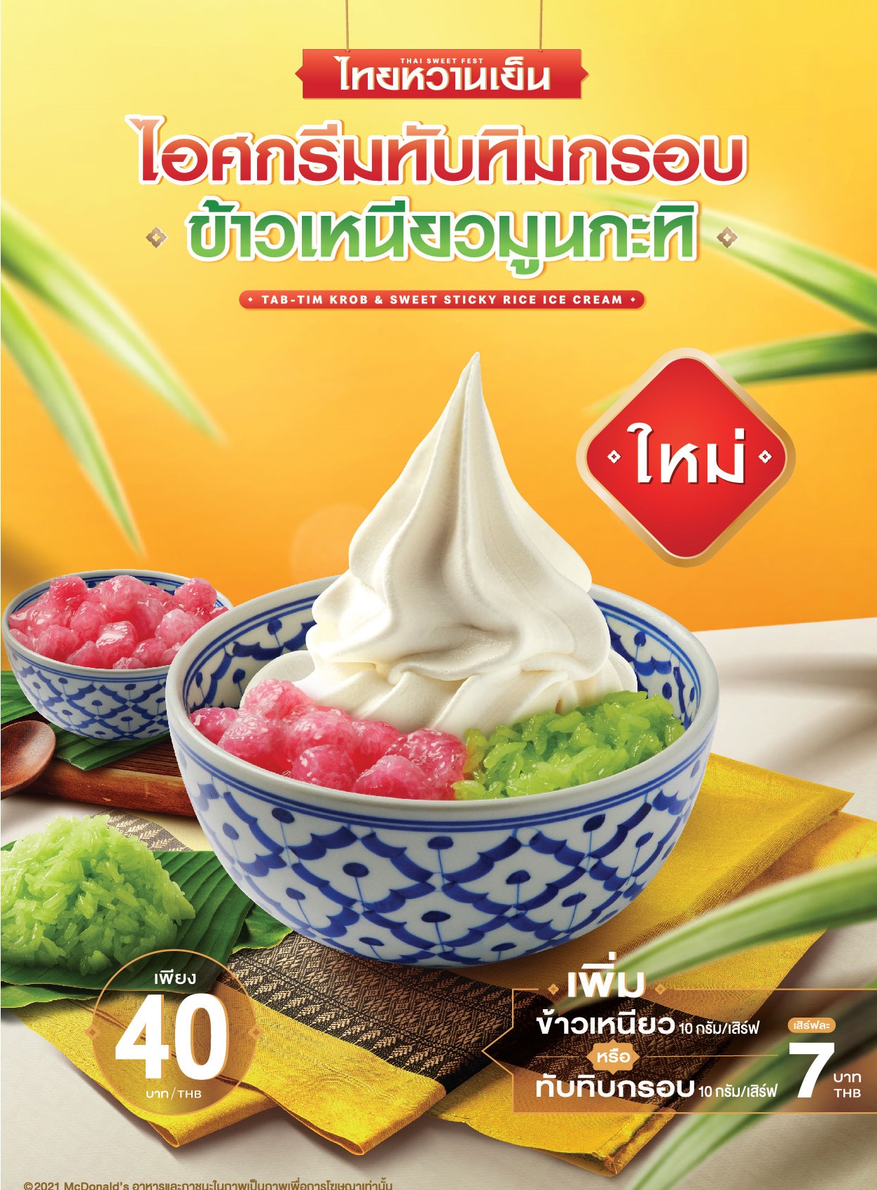 31 มีนาคม 2564 : แมคโดนัลด์ชวนเติมความสดชื่นกับเมนูหวานเย็นแบบไทยๆ ‘ไอศกรีมทับทิมกรอบข้าวเหนียวมูนกะทิ’ (Tab-Tim Krob & Sweet Sticky Rice Ice Cream) ไอศกรีมซอฟท์เสิร์ฟ ถ้วยโปรด พร้อมทับทิมกรอบ หนุบหนับ และข้าวเหนียวมูนกะทิ หอมกลิ่นใบเตย รสละมุน ที่คนไทยคุ้นเคย มาดับร้อนกับไทยหวานเย็น ในราคาเพียง 40 บาท สายหนักเครื่อง เน้นท้อปปิ้ง เพิ่มเพียงเมนูละ 7 บาท เท่านั้น พร้อมเสิร์ฟแล้วตั้งแต่วันที่ 31 มีนาคม – 1 มิถุนายน 2564 ที่ร้านแมคโดนัลด์สาขาที่ร่วมรายการทั่วประเทศ ทั้งรับประทานที่ร้าน, ซื้อกลับบ้าน, ไดร์ฟ ทรู และแมคดิลิเวอรี โทร.1711 ออนไลน์คลิก www.mcdonalds.co.th ตรวจสอบสาขาที่ร่วมรายการได้ที่ https://www.mcdonalds.co.th/faq ดูรายละเอียดเพิ่มเติมคลิก www.facebook.com/mcthai ![]()