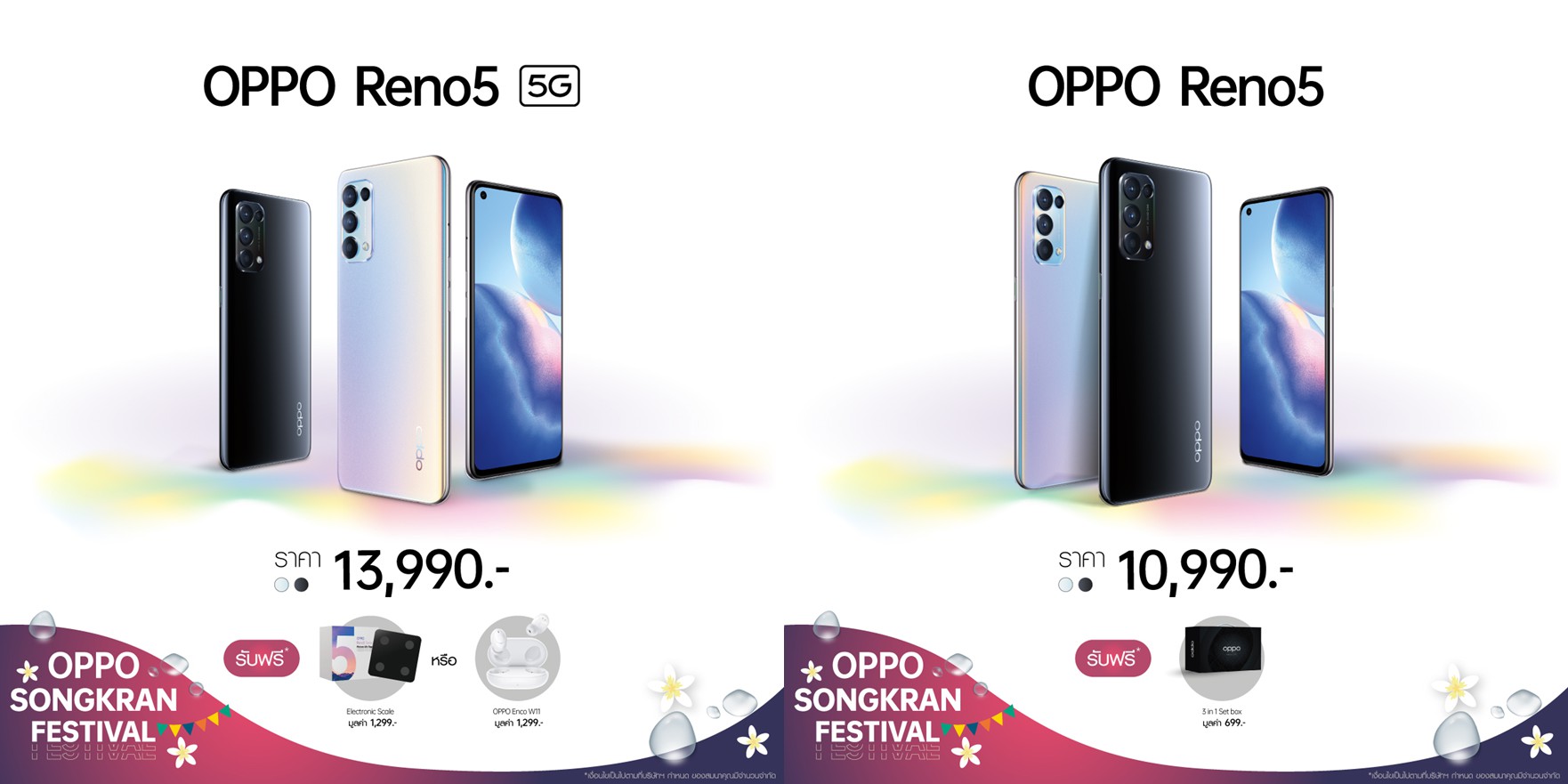 โดย OPPO Reno5 Series 5G ที่เข้าร่วมรายการมีทั้งหมด 2 รุ่น คือ OPPO Reno5 5G สมาร์ทโฟนที่รองรับการสื่อสารแห่งอนาคตด้วยเทคโนโลยี 5G พร้อมขุมพลัง Snapdragon 765G, RAM 8GB, ROM 128GB และ 65W SuperVOOC 2.0 ชาร์จไวขั้นสุดเพียง 35 นาที สามารถชาร์จได้ 100% มาในราคา 13,990 บาท พร้อมรับฟรี! เครื่องชั่งน้ำหนัก Electronic Scale หรือ หูฟังไร้สาย OPPO Enco W11 มูลค่า 1,299 บาท
