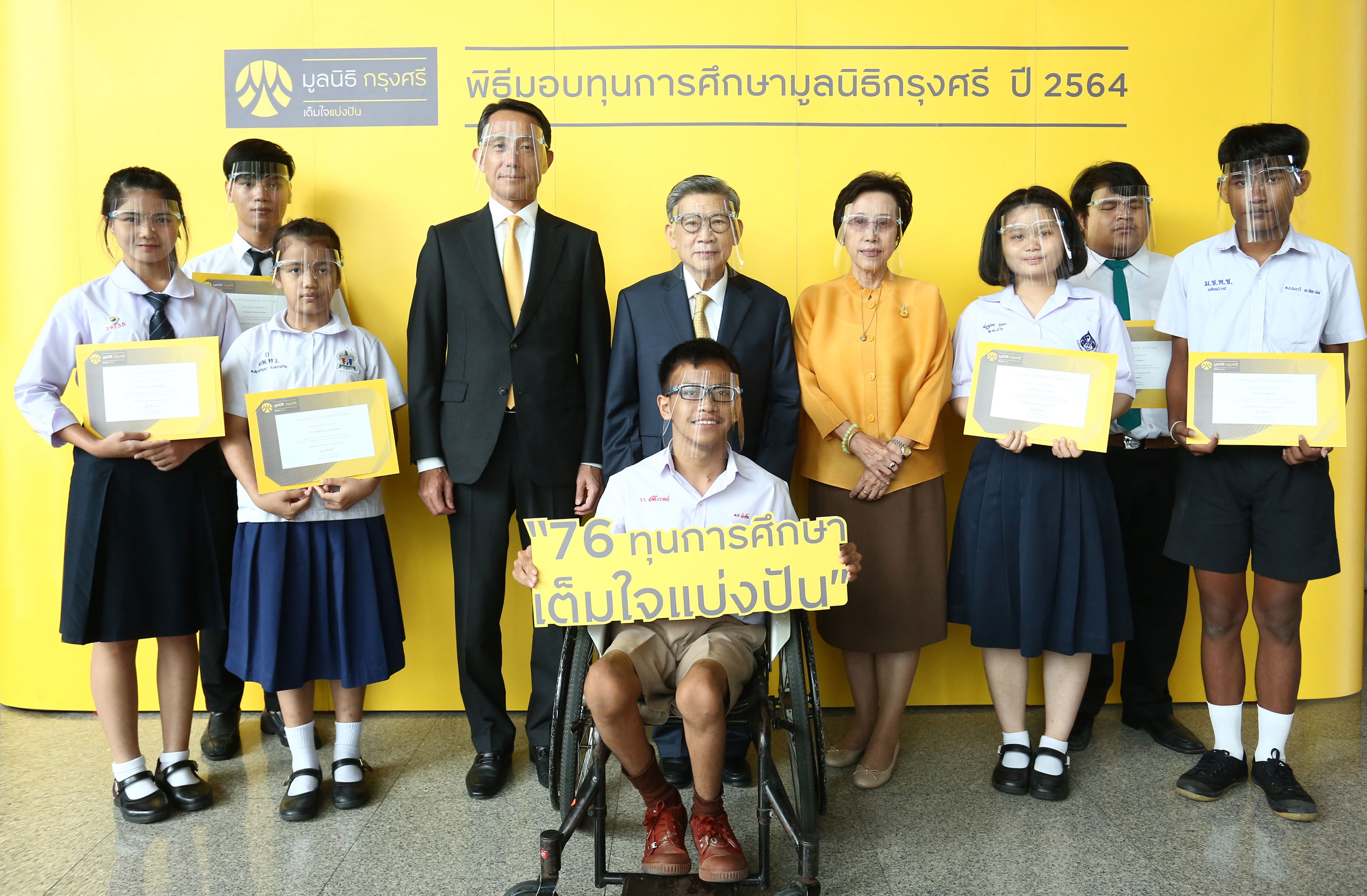 กรุงเทพฯ 5 เมษายน 2564 : การุณ กิตติสถาพร (กลาง) ประธานมูลนิธิกรุงศรี พร้อมด้วยกรรมการมูลนิธิฯ มอบทุนการศึกษาต่อเนื่องให้แก่เยาวชน 76 คนในความดูแลของสถานสงเคราะห์และมูลนิธิต่างๆ 7 แห่ง เพื่อสนับสนุนให้เยาวชนที่มีผลการเรียนและความประพฤติดีได้รับโอกาสทางการศึกษาจนสำเร็จการศึกษาในระดับปริญญาตรี ทั้งนี้ การมอบทุนการศึกษาดังกล่าวเป็นส่วนหนึ่งในการร่วมพัฒนาสังคมอย่างยั่งยืนตามพันธกิจของมูลนิธิกรุงศรี โดยจัดขึ้น ณ ธนาคารกรุงศรีอยุธยา อาคารสำนักงานใหญ่ ถนนพระราม 3 ![]()