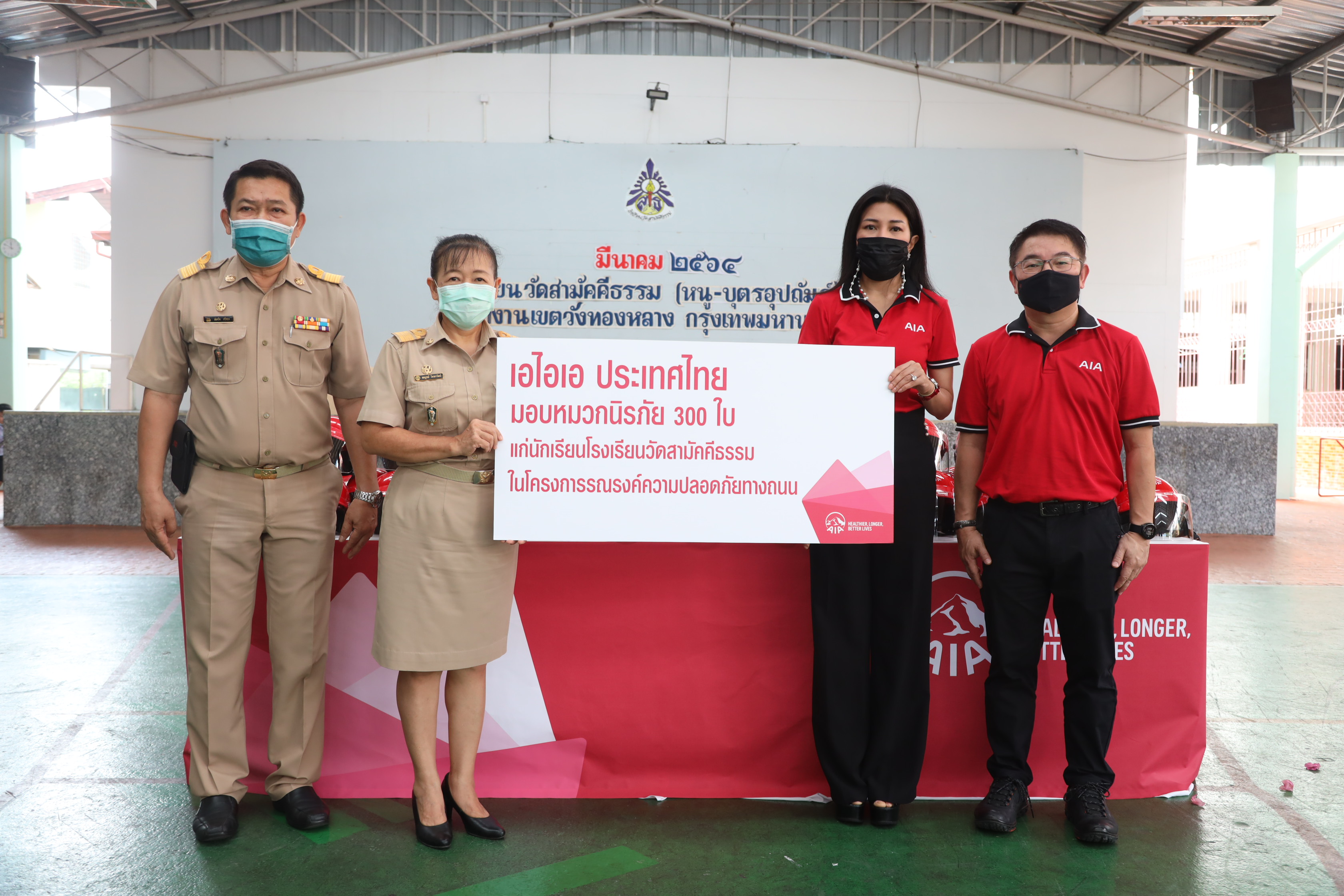 7 เมษายน 2564 : เอไอเอ ประเทศไทย นำโดย รพีพร วงศ์ทองคำ (ที่ 2 จากขวา) ผู้อำนวยการฝ่ายสื่อสารองค์กรและภาพลักษณ์ และ สุวิรัช พงศ์เสาวภาคย์ (ขวา) ผู้อำนวยการฝ่ายกำกับดูแลธุรกิจด้านกฎหมายและกิจการภายนอก เป็นตัวแทนมอบหมวกนิรภัยจำนวน 300 ใบ ให้แก่นักเรียนจากโรงเรียนวัดสามัคคีธรรม เพื่อส่งเสริมความปลอดภัยทางถนนให้แก่นักเรียนและเยาวชน อีกทั้ง กิจกรรมดังกล่าวยังเป็นส่วนหนึ่งของโครงการรณรงค์ความปลอดภัยทางถนนในช่วงเทศกาลสงกรานต์ ประจำปี 2564 ซึ่งจัดขึ้นโดยสำนักงานคณะกรรมการกำกับและส่งเสริมการประกอบธุรกิจประกันภัย (คปภ.) ซึ่งเอไอเอ ประเทศไทย มีความมุ่งมั่นในการสนับสนุนให้คนไทยมีสุขภาพและชีวิตที่ดีขึ้นผ่านโครงการต่างๆ เพื่อสังคมอย่างต่อเนื่อง สอดคล้องตามคำมั่นสัญญา ‘Healthier, Longer, Better Lives – เพื่อสุขภาพและชีวิตที่ดีขึ้น’ ![]()