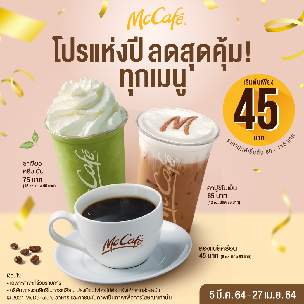 พร้อมเสิร์ฟหลากหลายความอร่อย ตั้งแต่วันที่ 5 เมษายน – 31 พฤษภาคม 2564 หรือจนกว่าสินค้าจะหมด ที่ร้านแมคคาเฟ่ทุกสาขาที่ร่วมรายการทั่วประเทศ บริการไดร์ฟ ทรู รวมทั้งบริการจัดส่งอาหารถึงบ้าน แมคดิลิเวอรี โทร.1711 เว็บไซต์ www.mcdonalds.co.th และแอปพลิเคชั่นของแมคโดนัลด์ ดูรายละเอียดเพิ่มเติมได้ที่ www.facebook.com/mcthai ![]()