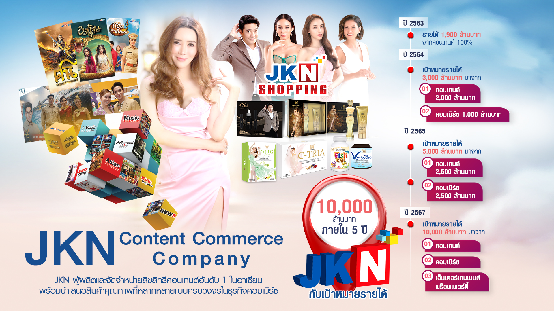 ทั้งนี้ ก้าวต่อไปของ JKN คือ สร้างการเติบโตแก่องค์กรอย่างยั่งยืนเพื่อประโยชน์ของผู้ถือหุ้น จากการผลักดันองค์กรไปสู่ Content Commerce Company โดยขยายธุรกิจไปยังสินค้าอุปโภคบริโภค (ธุรกิจ Commerce) ถือเป็นจุดเปลี่ยนที่สำคัญต่อการสร้างความยิ่งใหญ่ให้แก่บริษัทฯ จากการนำโมเดลความสำเร็จของกลุ่มธุรกิจ Content มาต่อยอดสร้างความเข้มแข็ง แก่ธุรกิจ Commerce ในผลิตภัณฑ์เสริมอาหารเพื่อสุขภาพและความงาม ภายใต้แบรนด์ Olig Fiber (โอลิก ไฟเบอร์), V-Allin (วี ออลิน), Hair now (แฮร์นาว), Instinct (อินสติงท์) และ C-TRIA by Anne JKN (ซีเทรีย) ผ่านกลยุทธ์ ‘ซูเปอร์สตาร์มาร์เก็ตติ้ง’