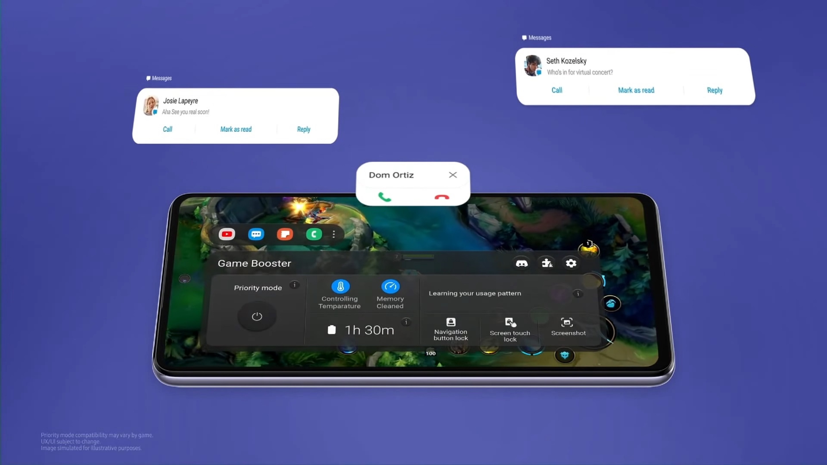 เพื่อประสบการณ์การเล่นที่ต่อเนื่อง Galaxy A72 ยังมาพร้อม Priority Mode ที่ตัดปัญหากวนใจอันดับหนึ่งอย่างสายโทรเข้าหรือการแจ้งเตือนที่มักเด้งขึ้นมาในเวลาสำคัญ พร้อมด้วยฟีเจอร์อื่นๆ เช่น จำกัดเวลาในการเล่น (Daily Limits) หรือตั้งแจ้งเตือนให้กลับเข้าเกมเมื่อถึงเวลา (Game Clock)