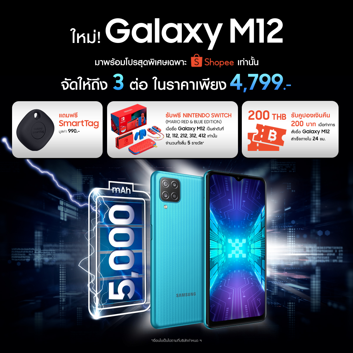 ถ้าใครอยากเป็นเจ้าของ Galaxy M12 แบบคุ้มยิ่งกว่าคุ้ม เตรียมตัวกันให้พร้อม! เพราะในวันแรกของวันวางจำหน่าย ซัมซุงได้จับมือกับ ช้อปปี้ เฉลิมฉลองแคมเปญ Shopee 5.5 Lowest Price Festival จัดโปรโมชั่นมอบราคาสุดพิเศษเฉพาะที่ร้าน Samsung Official Store บน Shopee Mall เท่านั้น ให้เหล่านักช้อปสามารถเป็นเจ้าของ Galaxy M12 ได้อย่างสุดคุ้มในราคา 4,599 บาท พร้อมแจกเกมคอนโซลแห่งยุค Nintendo Switch มูลค่า 16,990 บาท ไว้ให้คลายเหงา จำนวน 5 รางวัล